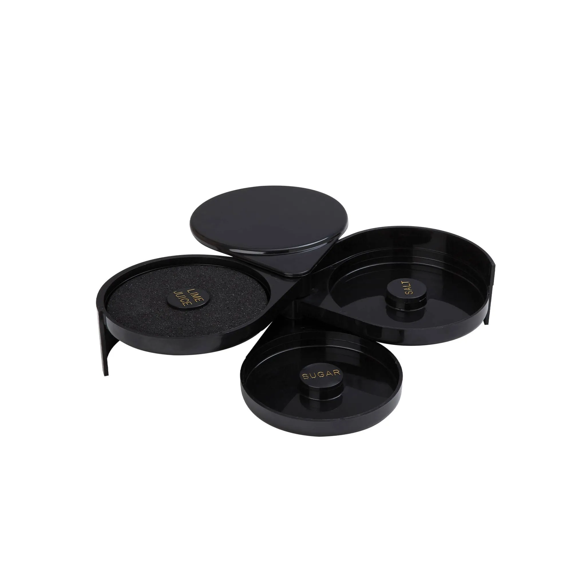Use this black 3-part glass rimmer to add flair and flavour to your drinks. It has three compartments for storing salt, sugar and citrus juice.