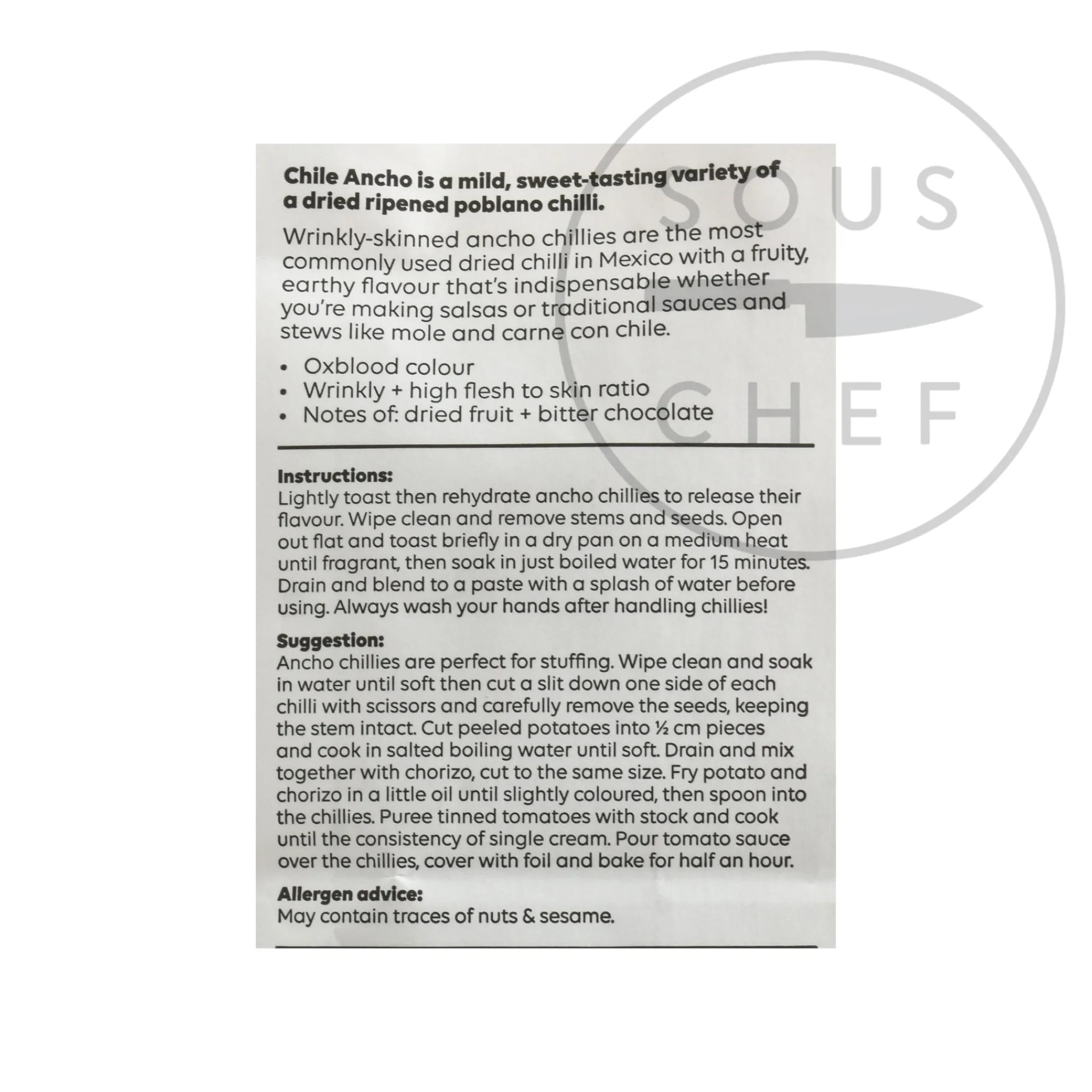 Dark oxblood red and wrinkled, these dried chillies have notes of dried fruit and bitter chocolate. They are delicious stuffed with chorizo and simmered in a tomato sauce, or blended with spices for a stew base.