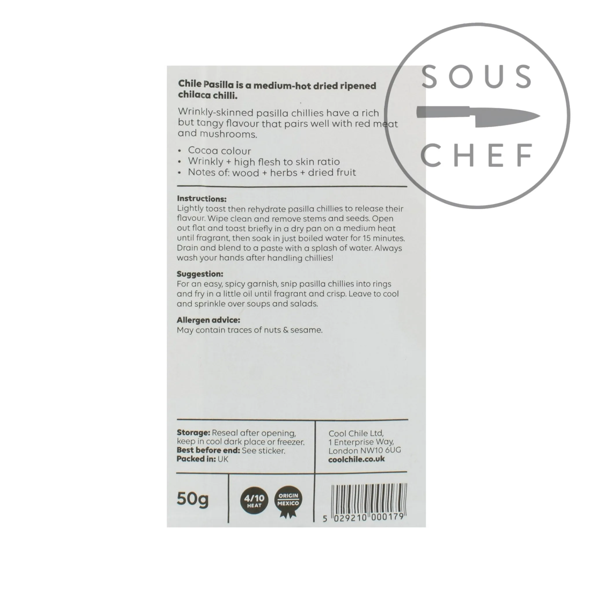 The pasilla chilli has a dark cocoa colour and wrinkly skin. It has notes of woods, herbs and dried fruit and is a medium to low heat.