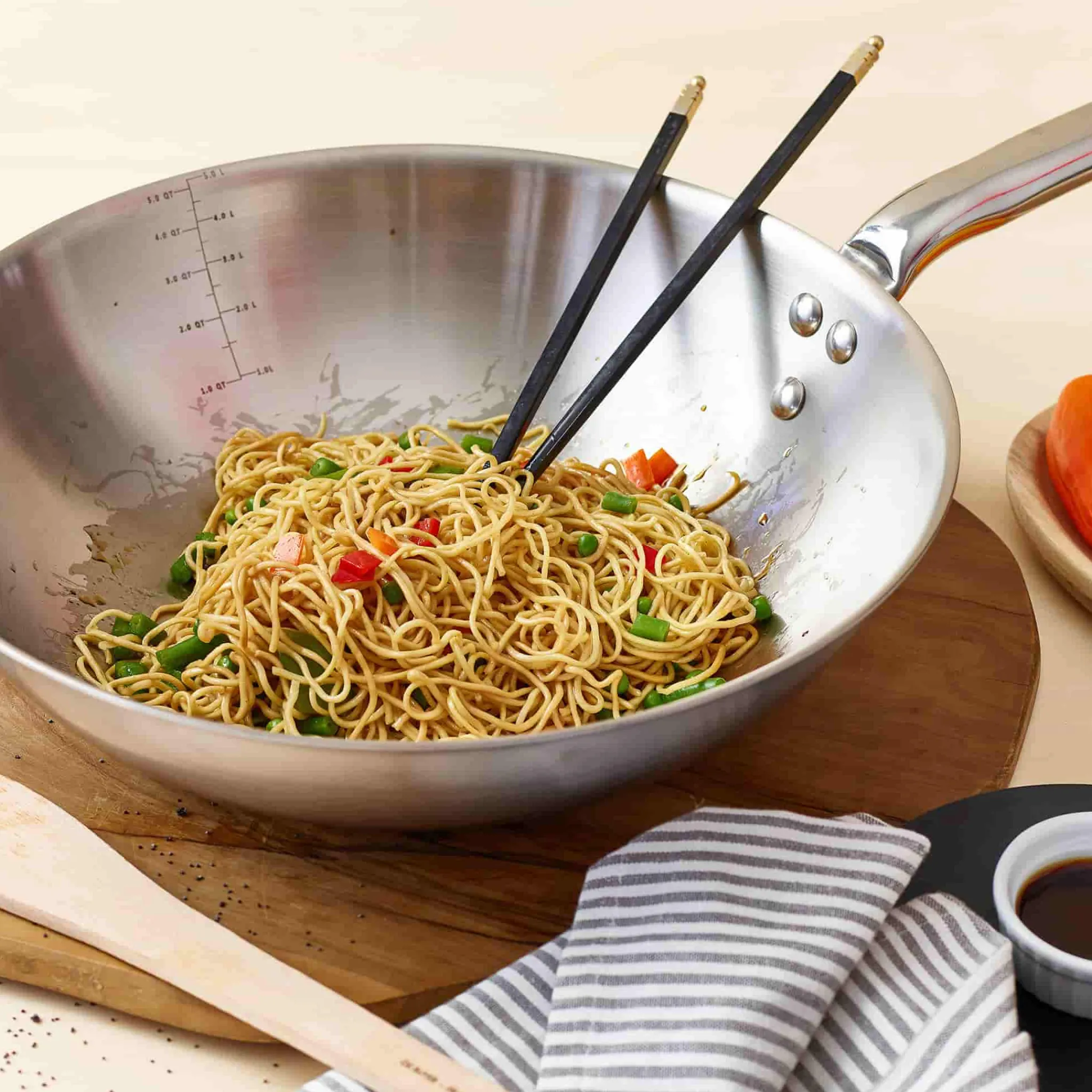 Useful volume marks on the inside of the pan mean you can measure out liquid and cook at the same time. With a brushed finish, this wok is a smart and practical kitchen addition.