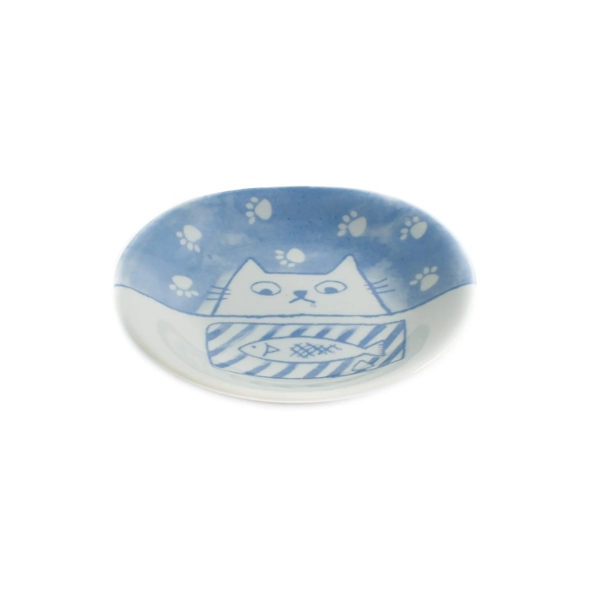 Use this blue and white Japanese plate to serve dishes like prawn gyoza and seaweed salad. It’s also ideal for Japanese-inspired desserts like yuzu tartlets and matcha tea and chocolate cookies. The round plate depicts a white cat eyeing up a tasty fish supper.
