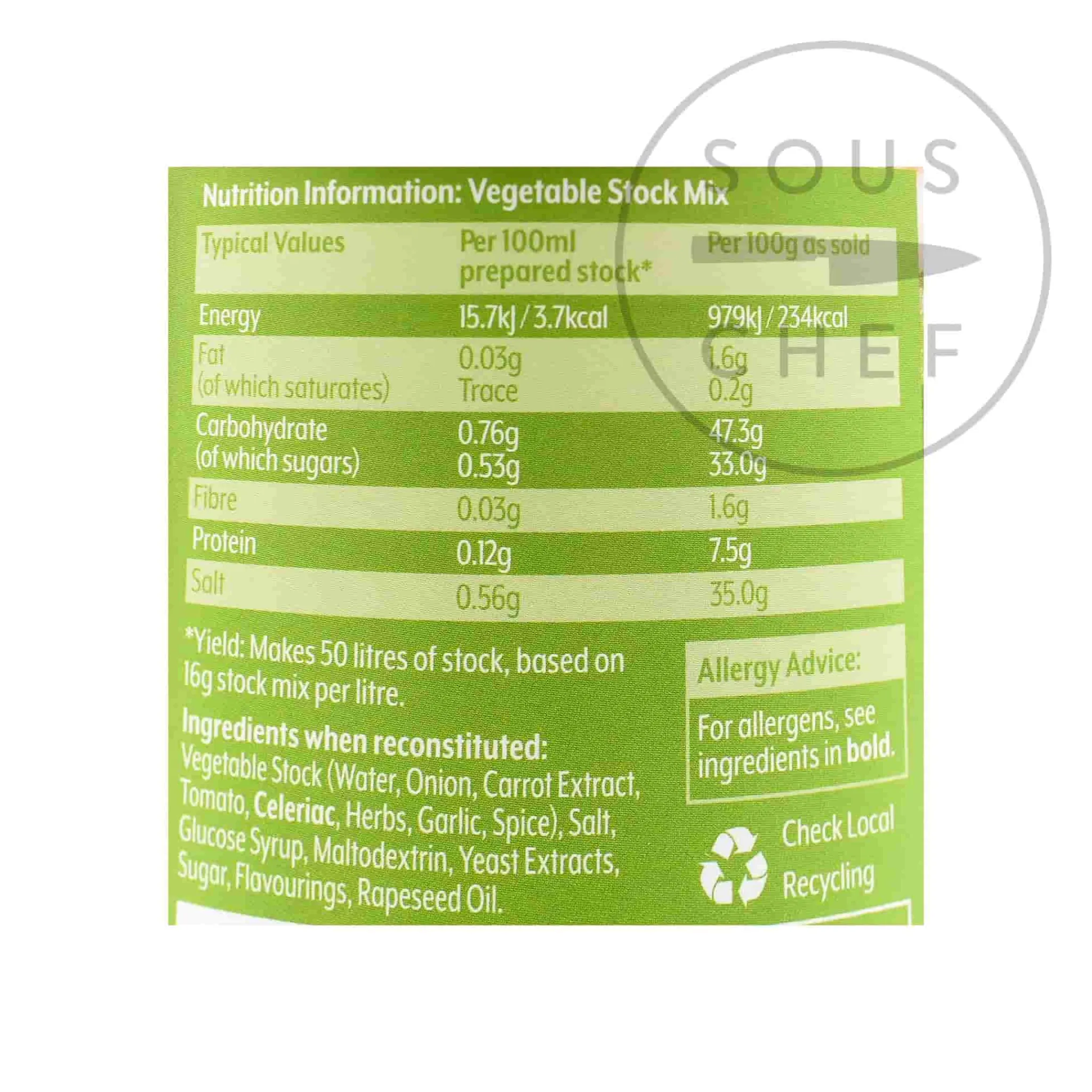 Product formulations and details may change. For the latest ingredients and allergen information always check product packaging prior to consumption. Ingredients: Vegetable stock (water, onion, carrot extract, tomato, celeriac, herbs, garlic, spice), salt, glucose syrup, maltodextrin, yeast extracts, sugar, flavourings, rapeseed oil.