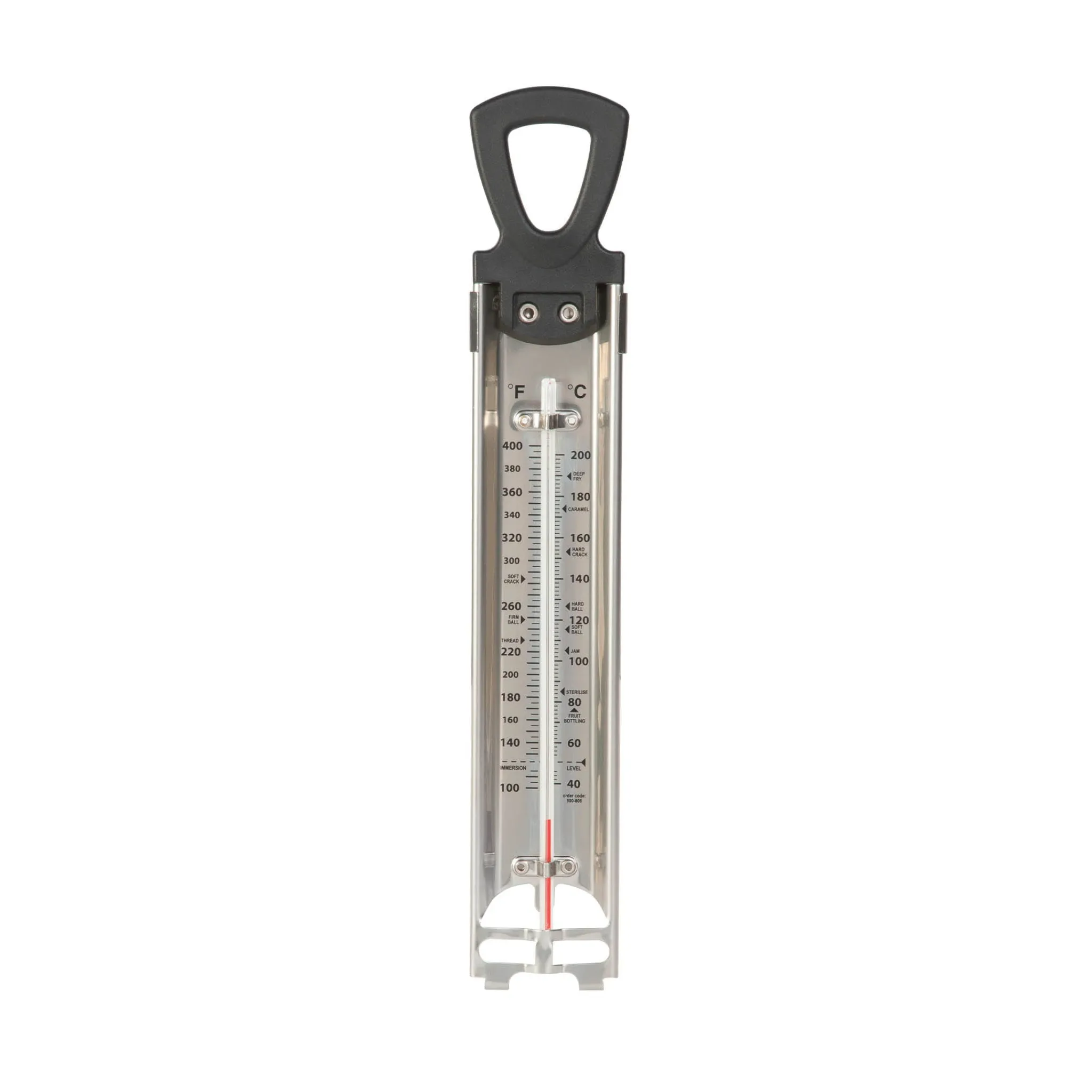 The steel thermometer displays temperatures in both celsius and fahrenheit from 40 to 200°C. There are markings to indicate the ideal temperature for jam, caramel, frying and sterilising, as well as specific candy-making temperatures (soft ball, hard ball, soft crack, hard crack).