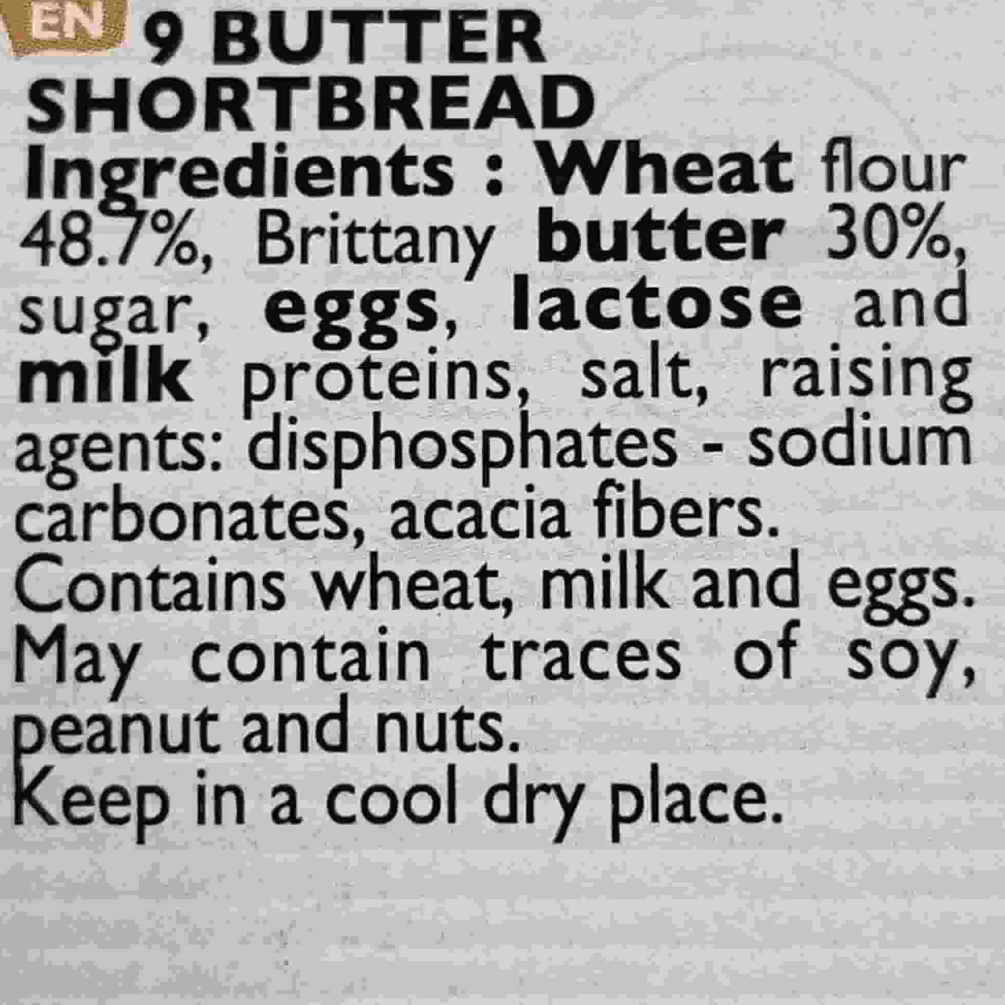 Product formulations and details may change. For the latest ingredients and allergen information always check product packaging prior to consumption. Ingredients: Wheat flour 48.7%, brittany butter 30%, sugar, eggs, lactose and milk proteins, salt, raising agents: diphosphates, sodium carbonates, acacia fibres.