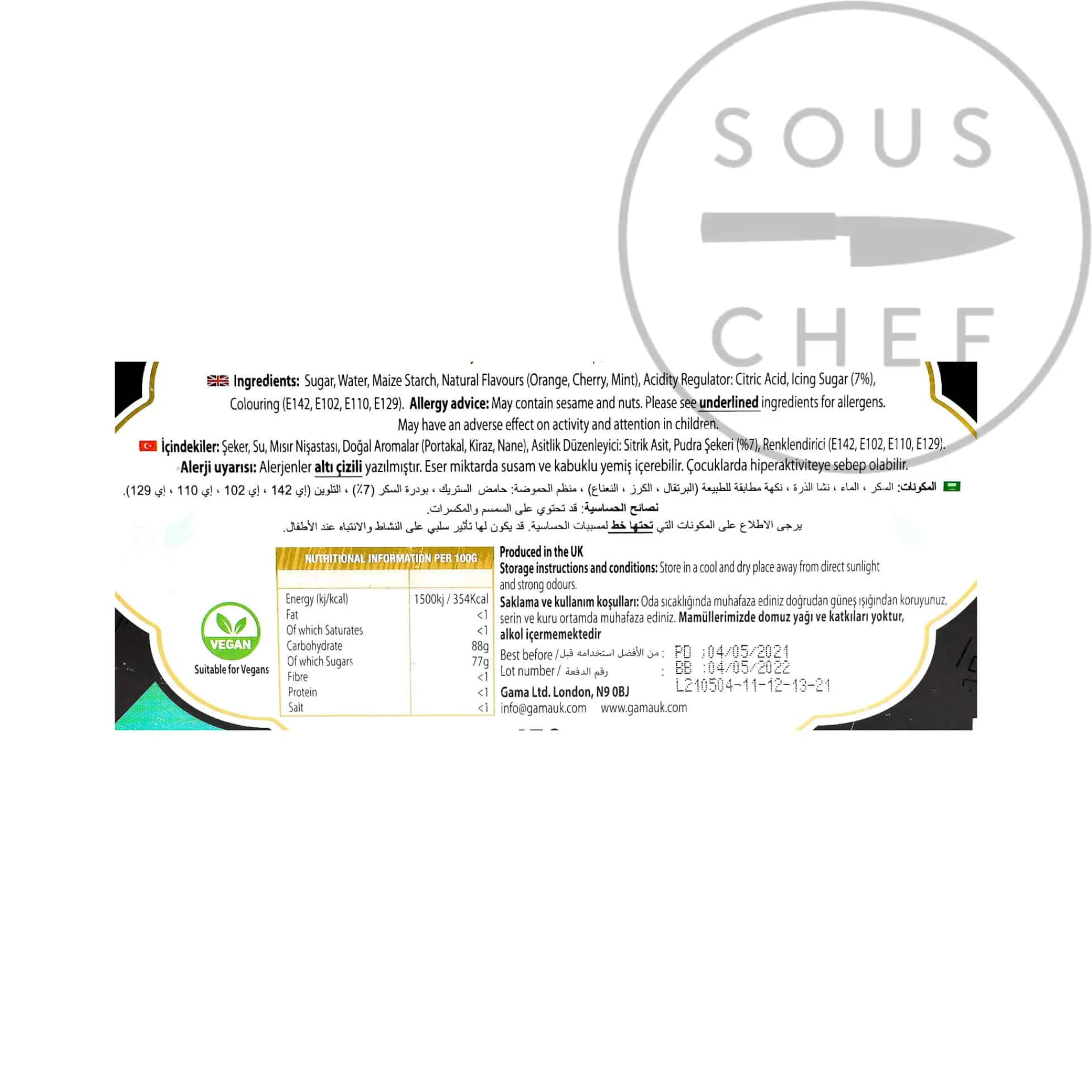 Product formulations and details may change. For the latest ingredients and allergen information always check product packaging prior to consumption. Ingredients: sugar, water, maize starch, natural flavours (orange, cherry, mint), acidity regulator: citric acid, icing sugar (7%), colouring (E142, E102, E110, E129)