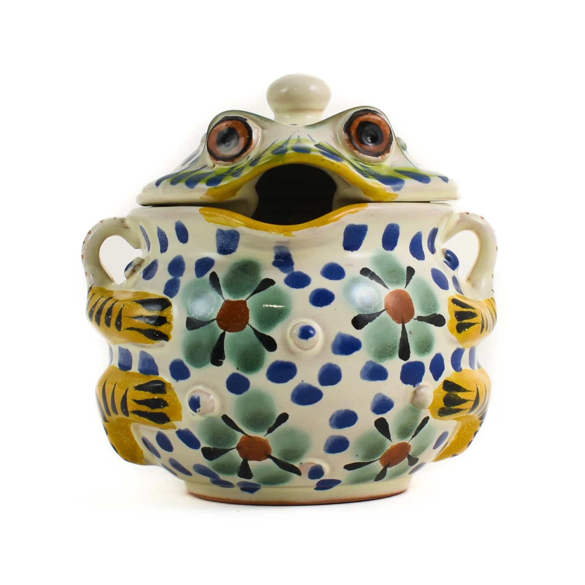 This frog-shaped sugar bowl is decorated with flowers and polka dots. Made in Mexico, it;s hand-painted in shades of green and blue.