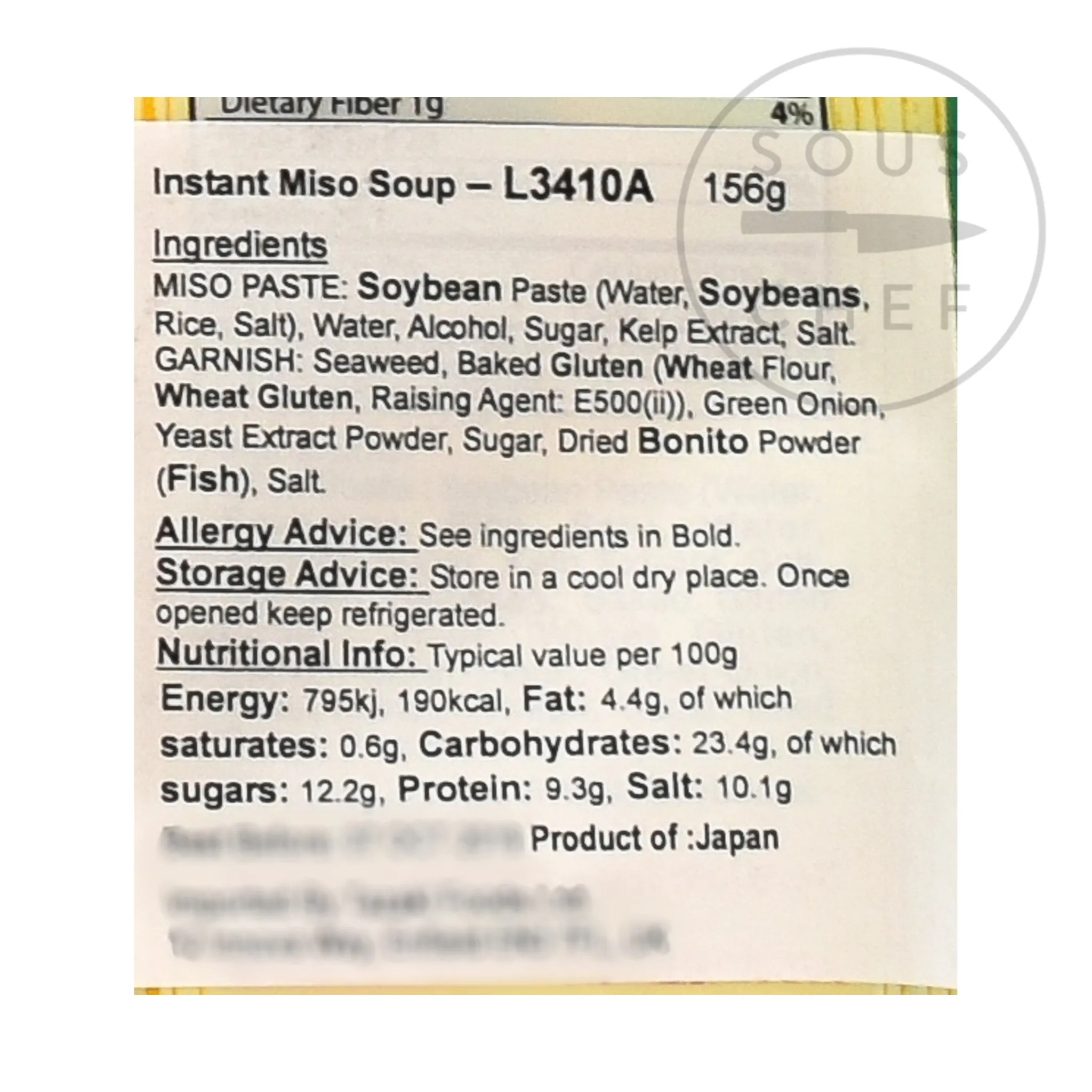 Product formulations and details may change. For the latest ingredients and allergen information always check product packaging prior to consumption. Ingredients: Soup Base soybean paste (water, soybean,rice, salt), water, alcohol, sugar, kelp extract, salt. Garnish seaweed, baked gluten (wheat flour, wheat gluten, raisign agent: E500ii), green onion, yeast extract powder, sugar, dried bonito powder (fish), salt. Contains soya, wheat, fish.