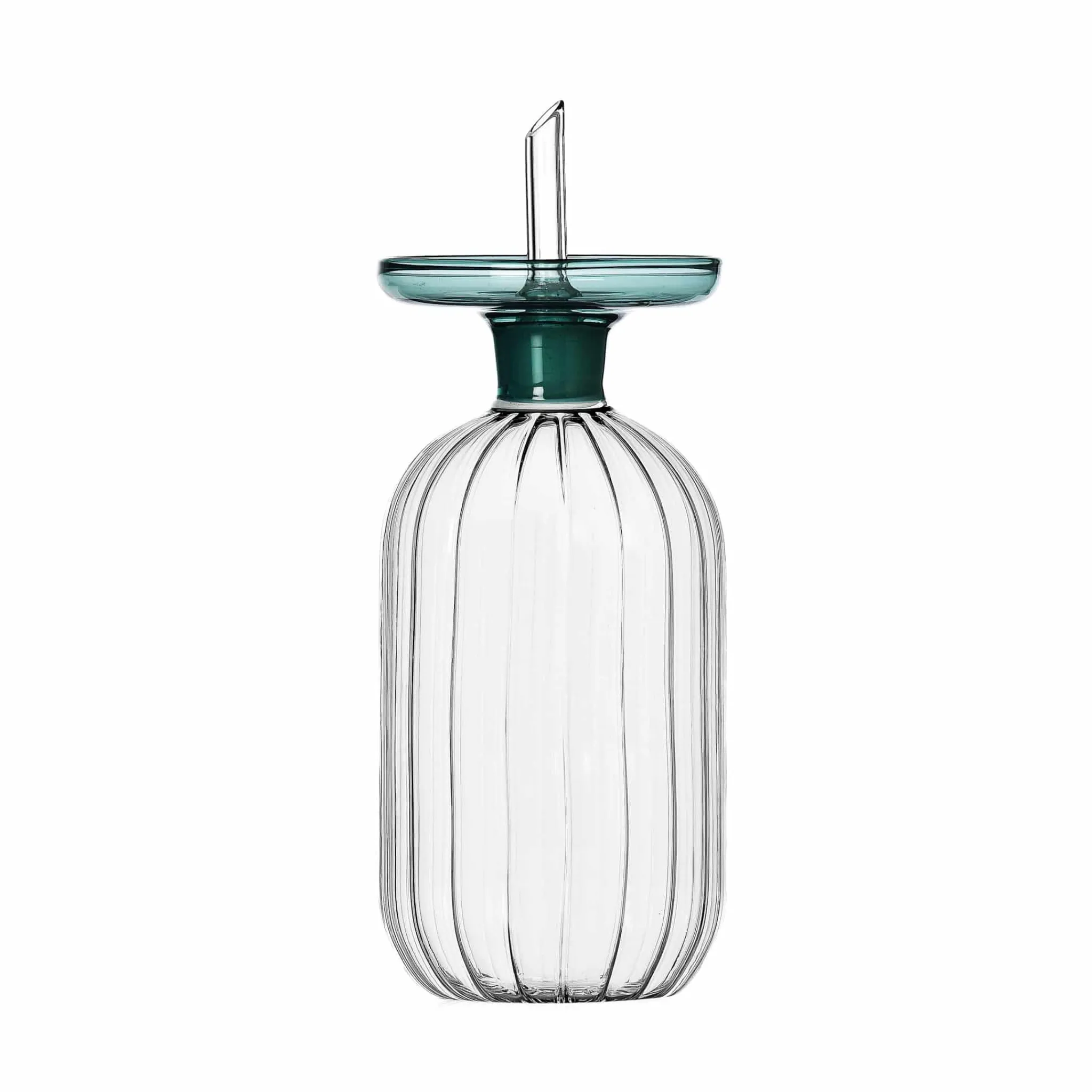 Made from flame-worked glass, the bottle has a transparent, fluted body. You can use it to store olive oil for marinades and Mediterranean meals. The bottle is topped with a wide blue stopper.