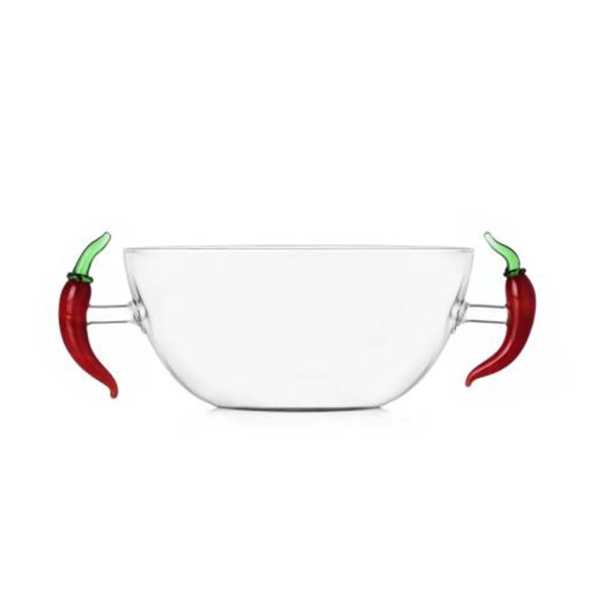 Fill Ichendorf Milano’s chilli pepper snacking bowl with spicy nuts, olives or your favourite crisps. Made from flame-worked borosilicate glass, the bowl has curved handles shaped like bright red chilli peppers. Whether you’re planning a cosy movie night or a Mexican-themed fiesta, this chilli pepper bowl is sure to spice things up. Why not fill it with homemade guacamole or a fiery tomato salsa?