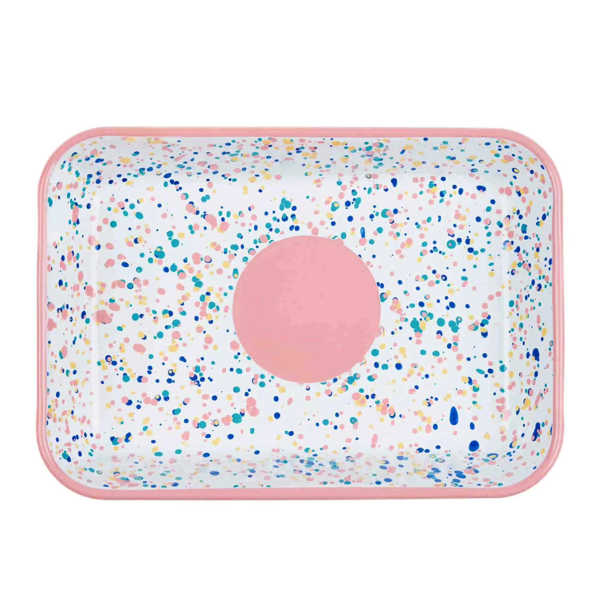 This pink dot roasting dish is as versatile as it is beautiful. You can use it on the hob, in the oven and as a serving dish for all your favourite baked creations. It features colourful paint splatters and a candyfloss pink rim and central dot design. Use it for cheesy pasta bakes, roasted root vegetables and one-pan traybakes.