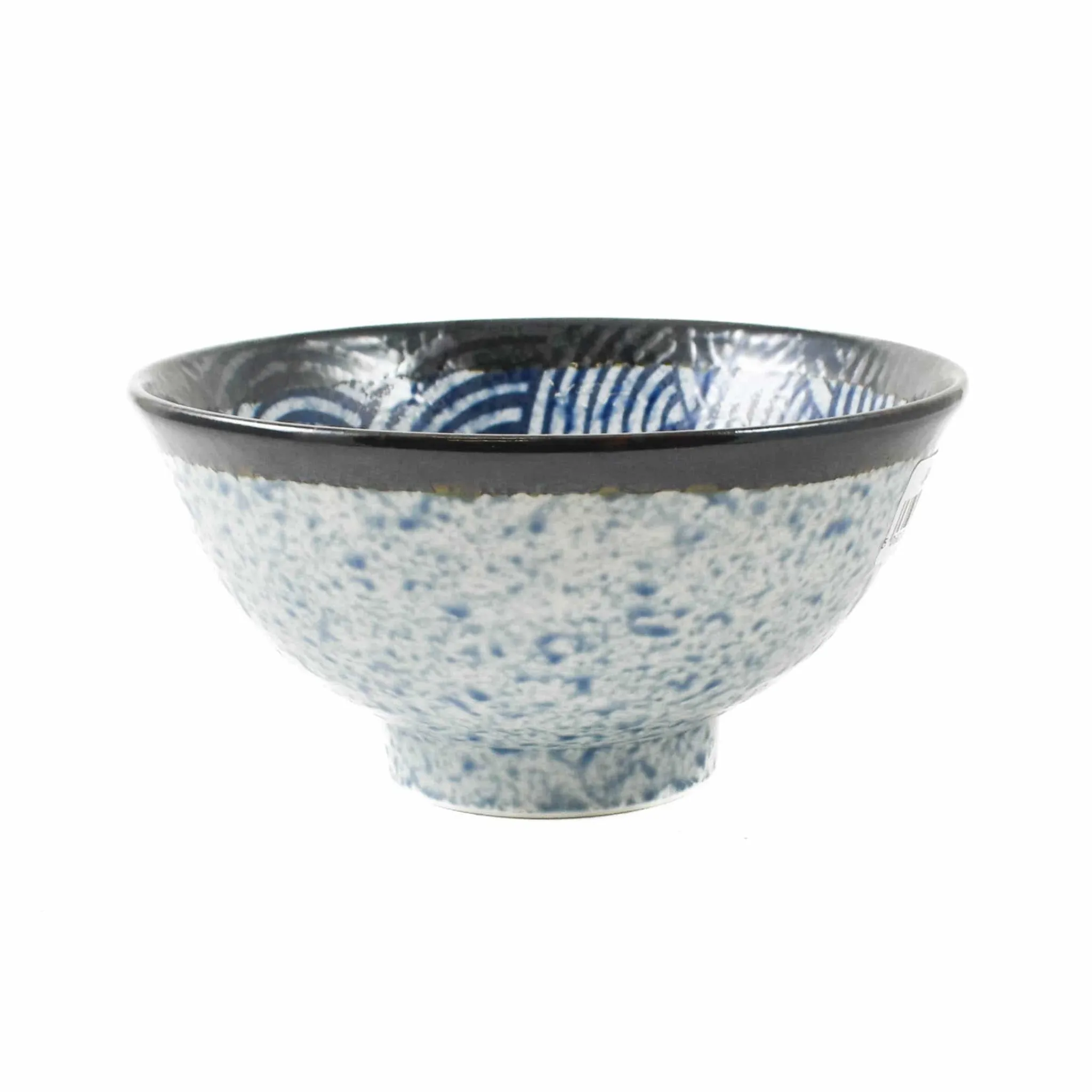 The rice bowl is decorated with a textured white and blue glaze in a stylised wave pattern. The bowl is finished with a glossy brown-black border.