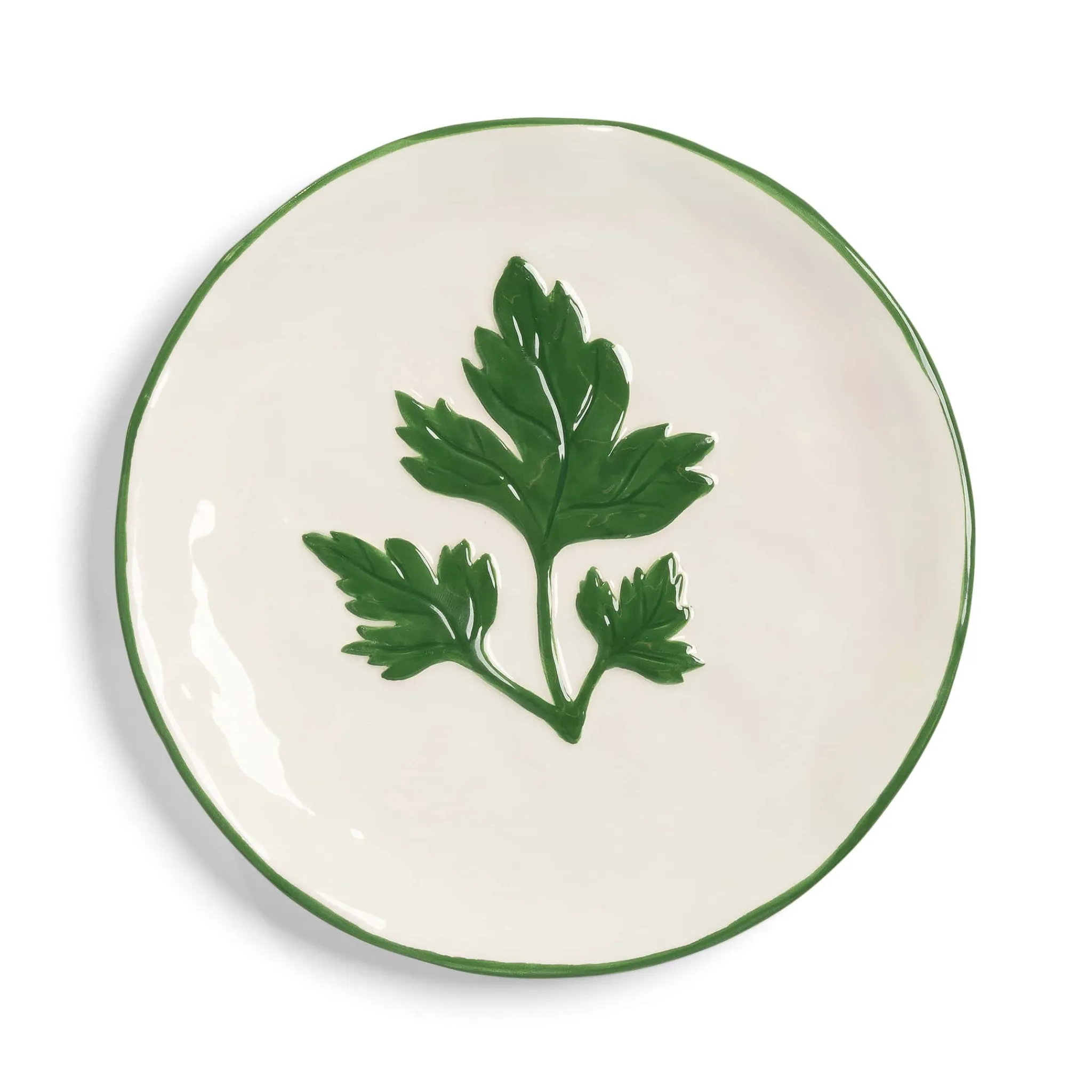 The white colander is covered with hand-painted parsley leaves. It looks beautiful displayed on a shelf or counter when not in use.