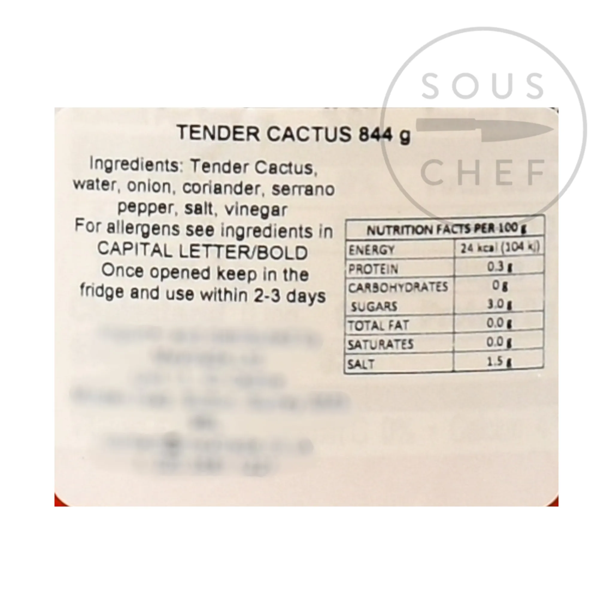 Product formulations and details may change. For the latest ingredients and allergen information always check product packaging prior to consumption. Ingredients: tender cactus, water, onion, coriander, serrano peppers, salt, vinegar.