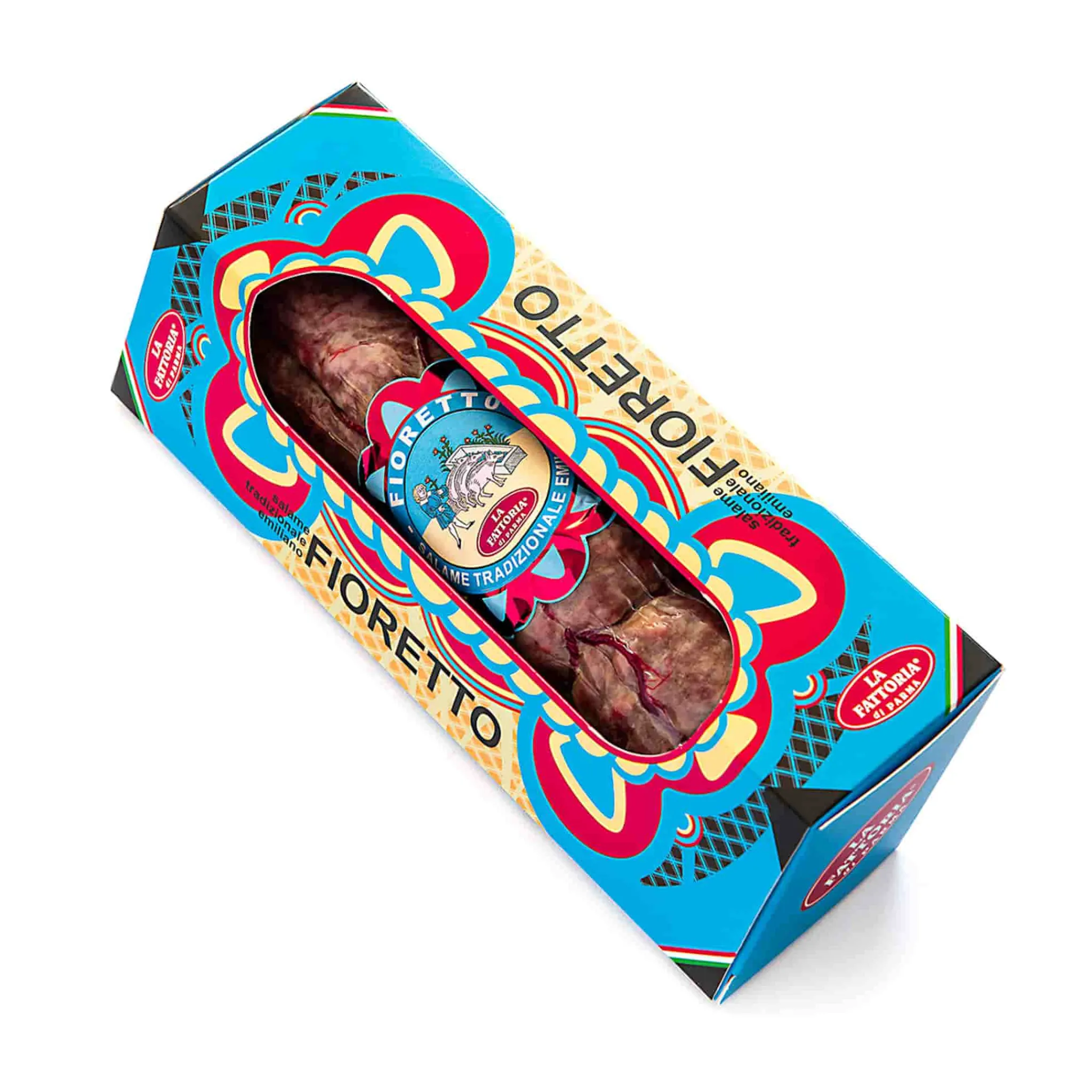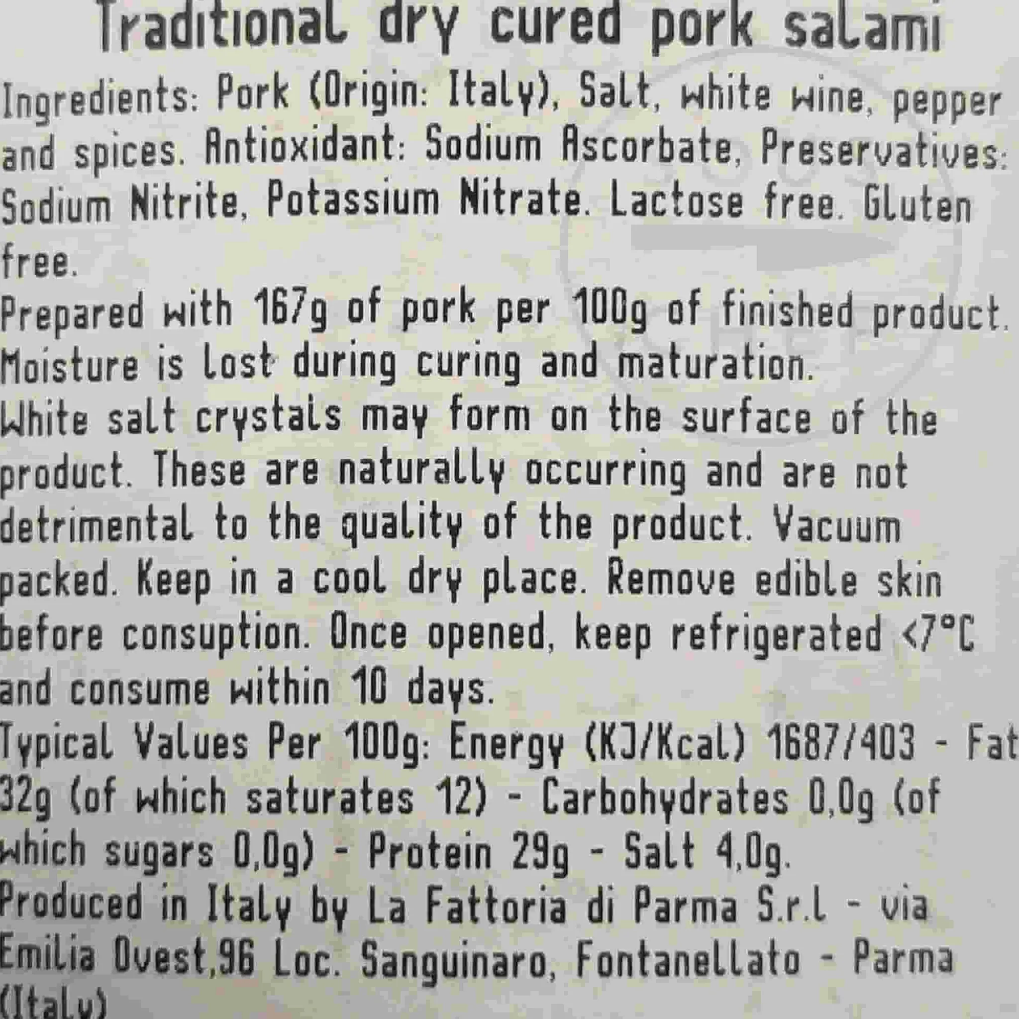 To serve traditionally, carve on the diagonal into thin slices and enjoy with a glass of red wine or a cold beer. Produced by La Fattoria di Parma, a family-owned company based in northern Italy, this premium salami makes a delicious snack or picnic treat.