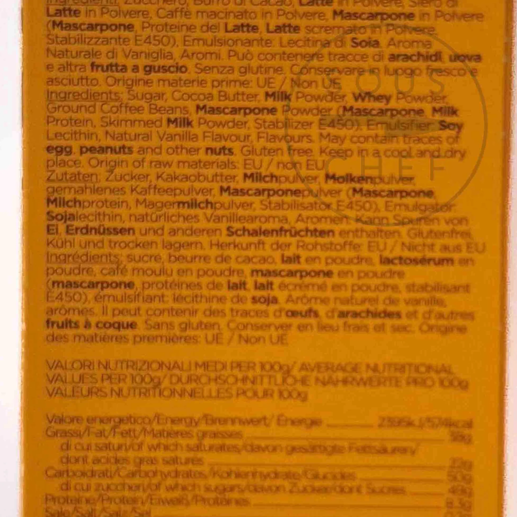 Product formulations and details may change. For the latest ingredients and allergen information always check product packaging prior to consumption. Ingredients: Sugar, cocoa butter, milk powder, whey powder, ground coffee beans 1.5%, mascarpone powder 1.5% (mascarpone, milk protein, skimmed milk powder, stabilizer e450), emulsifier: soy lecithin, natural vanilla flavour, flavours.