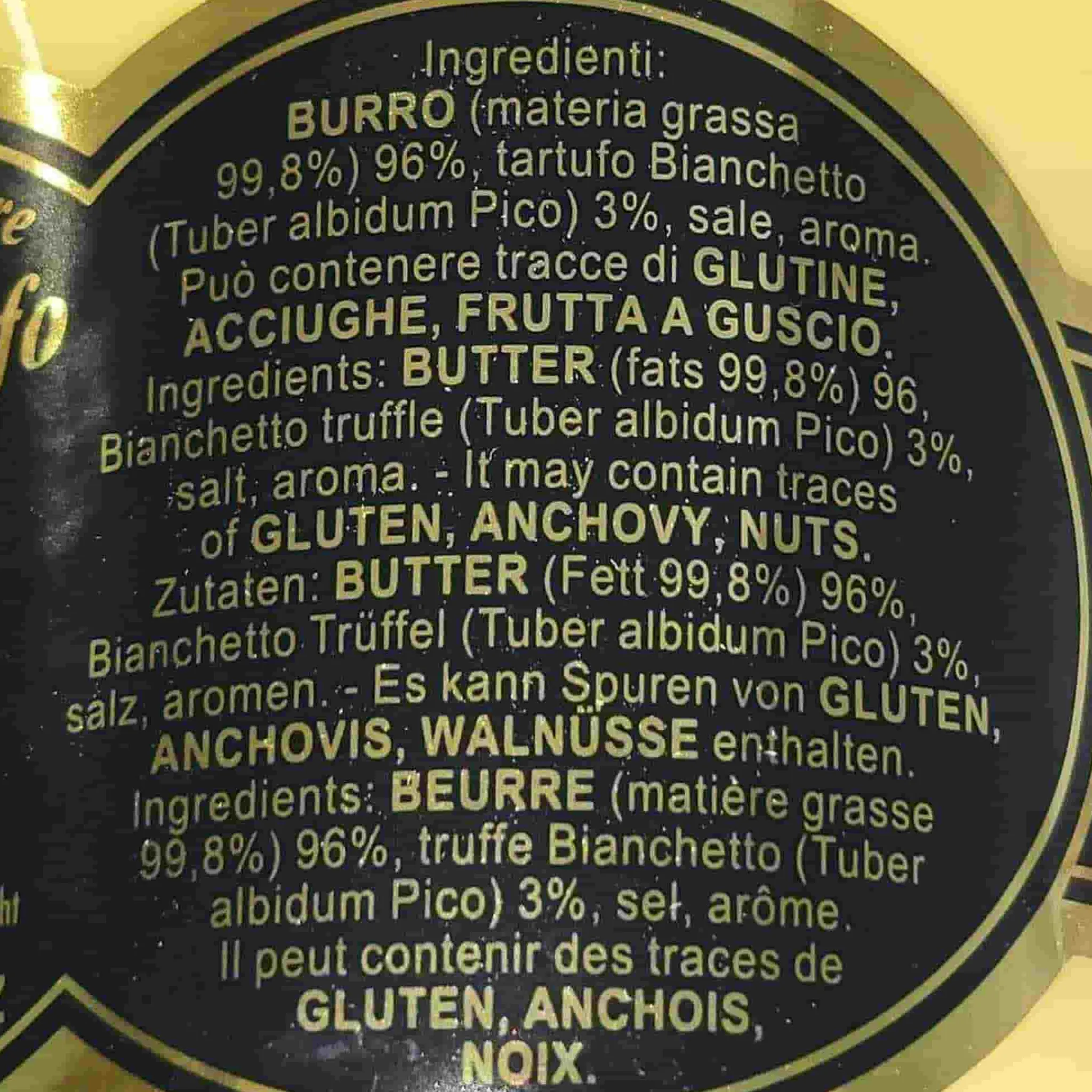 Product formulations and details may change. For the latest ingredients and allergen information always check product packaging prior to consumption. Ingredients: Butter, truffles (tuber borchii vitt) 2%, salt, truffle aroma. Made in a factory which handles wheat, milk, celery, anchovies, nuts.