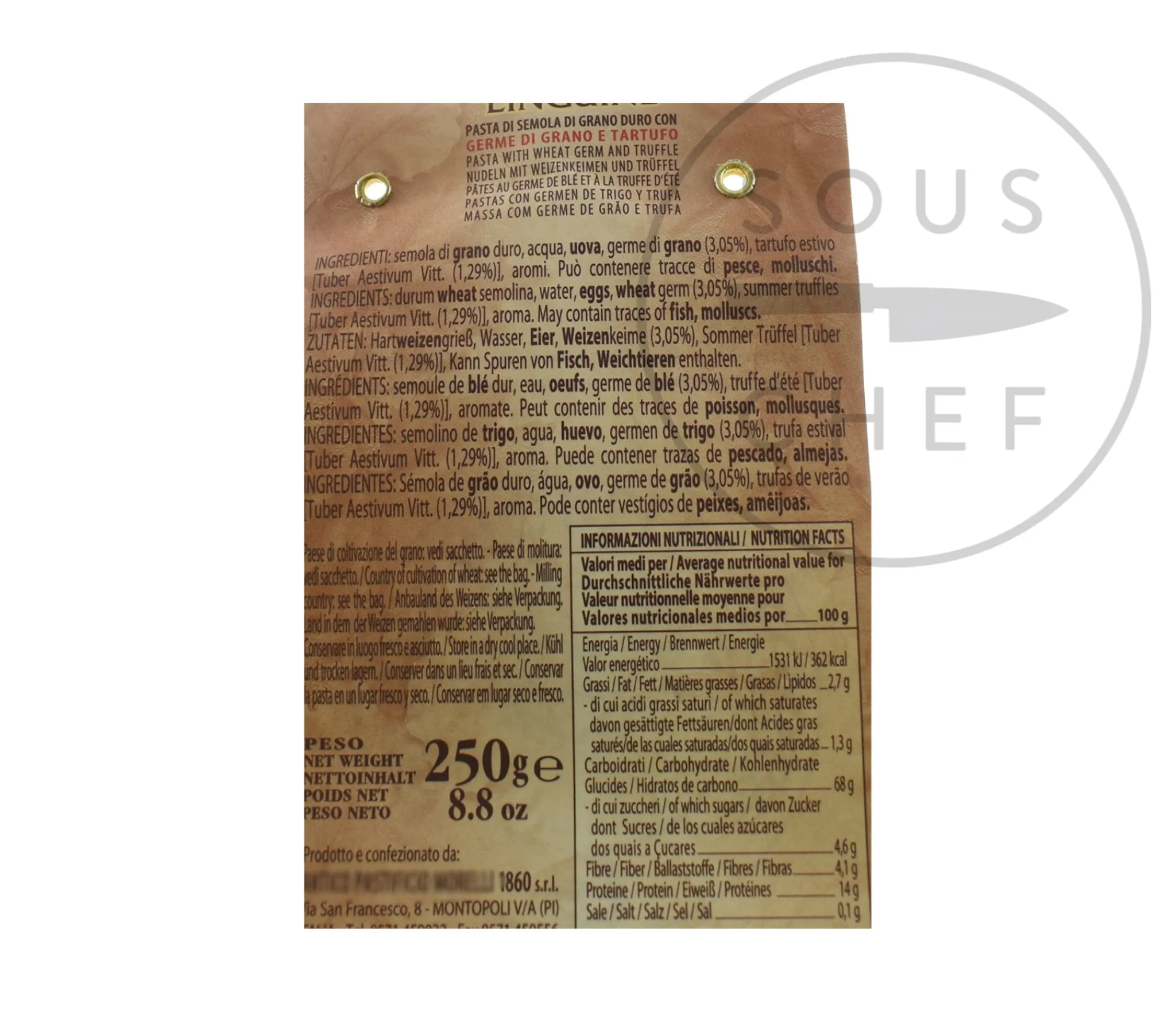 Product formulations and details may change. For the latest ingredients and allergen information always check product packaging prior to consumption. Ingredients: Durum wheat semolina, water, eggs, wheat germ (3.05%), summer truffles (Tuber Aestivum Vitt. (1.29%)), aroma.