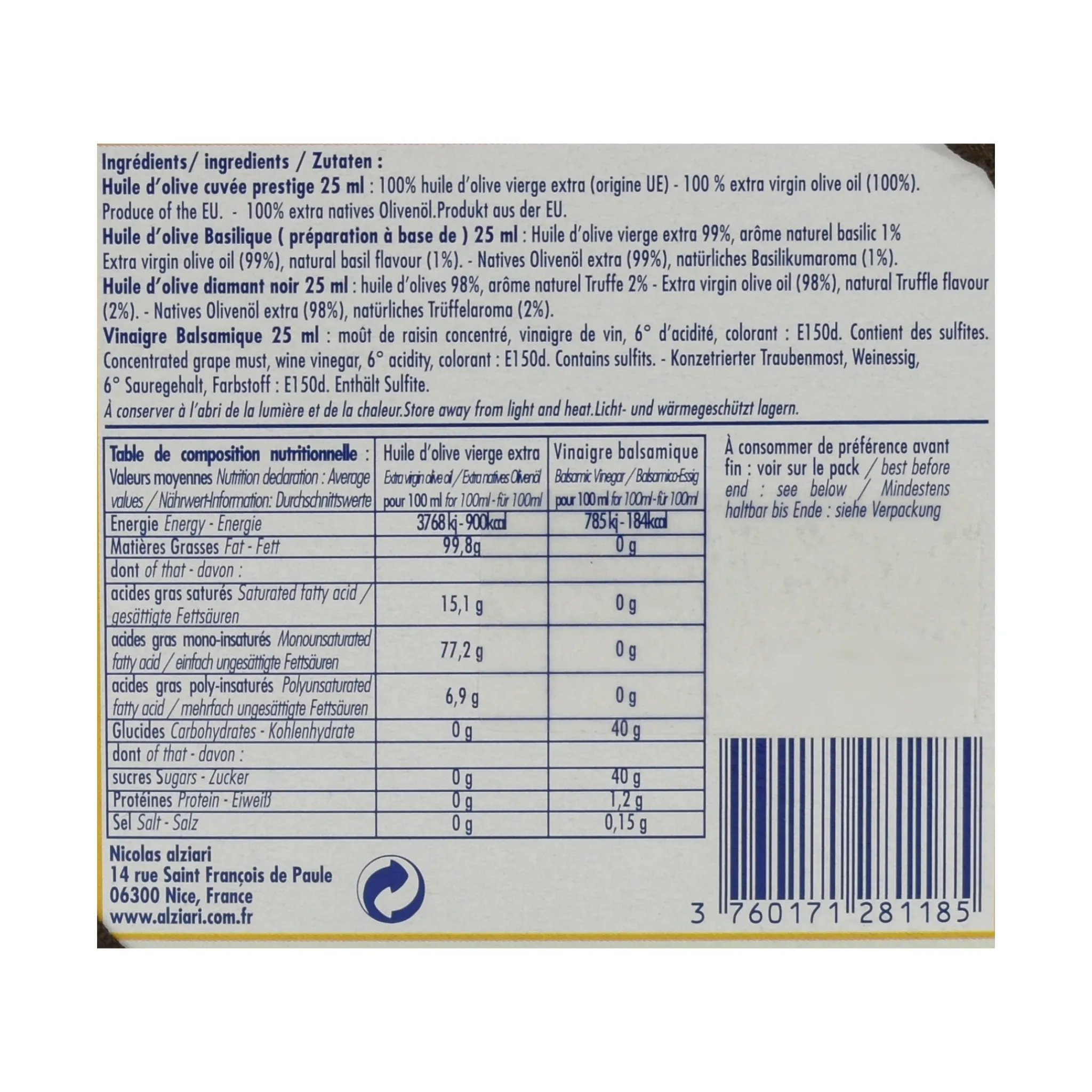 Each set includes three extra virgin olive oils – one of Alziari’s soft & fruity blend, one flavoured with basil and one flavoured with truffle. There’s also a sample of Alziari’s 3-year aged balsamic vinegar.