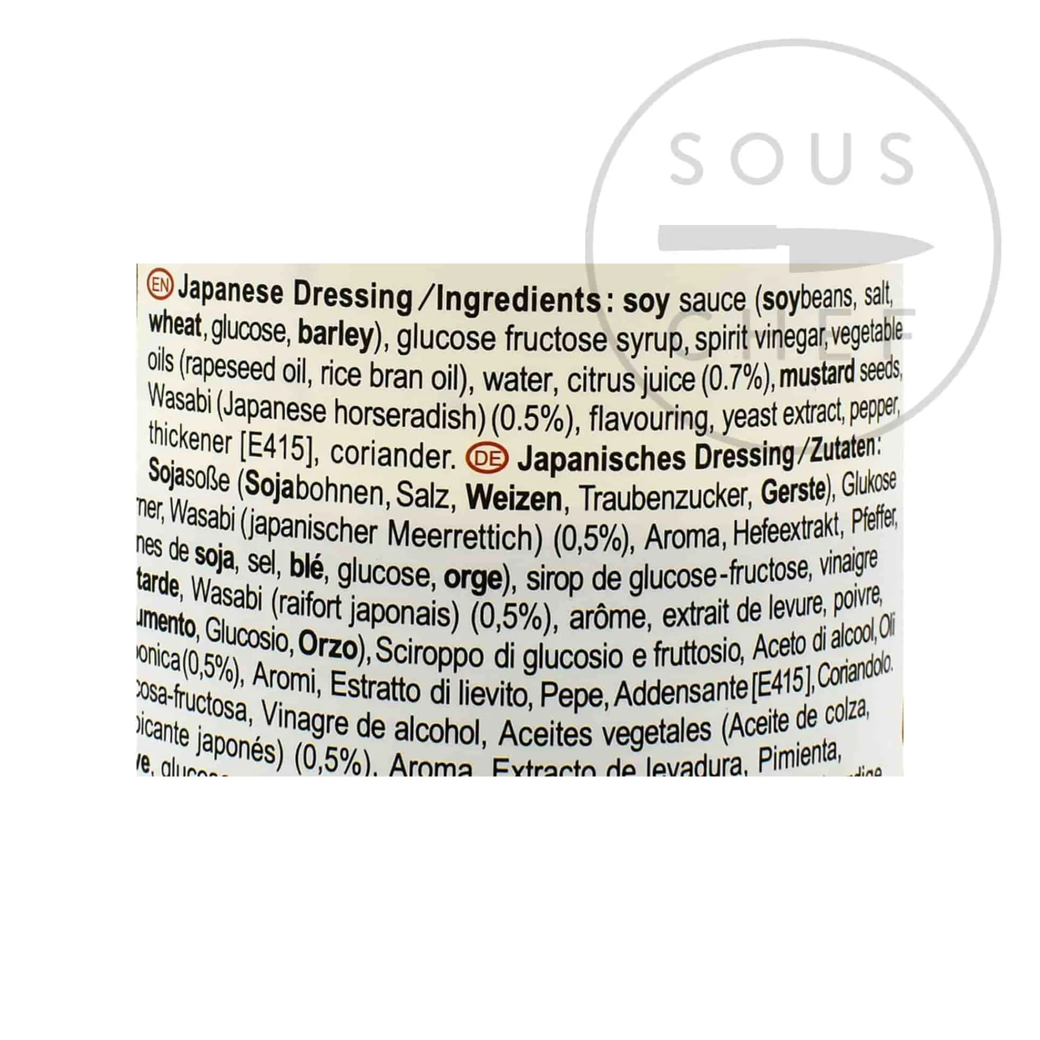 Product formulations and details may change. For the latest ingredients and allergen information always check product packaging prior to consumption. Ingredients: Soy sauce (soybeans, salt, wheat [gluten], glucose, barley [gluten], high fructose corn syrup, vinegar, rapeseed oil, water, citrus juice (0.7%), mustard, wasabi (japanese horseradish) (0.5%), flavouring, yeast extract, pepper, thickener: e415, coriander