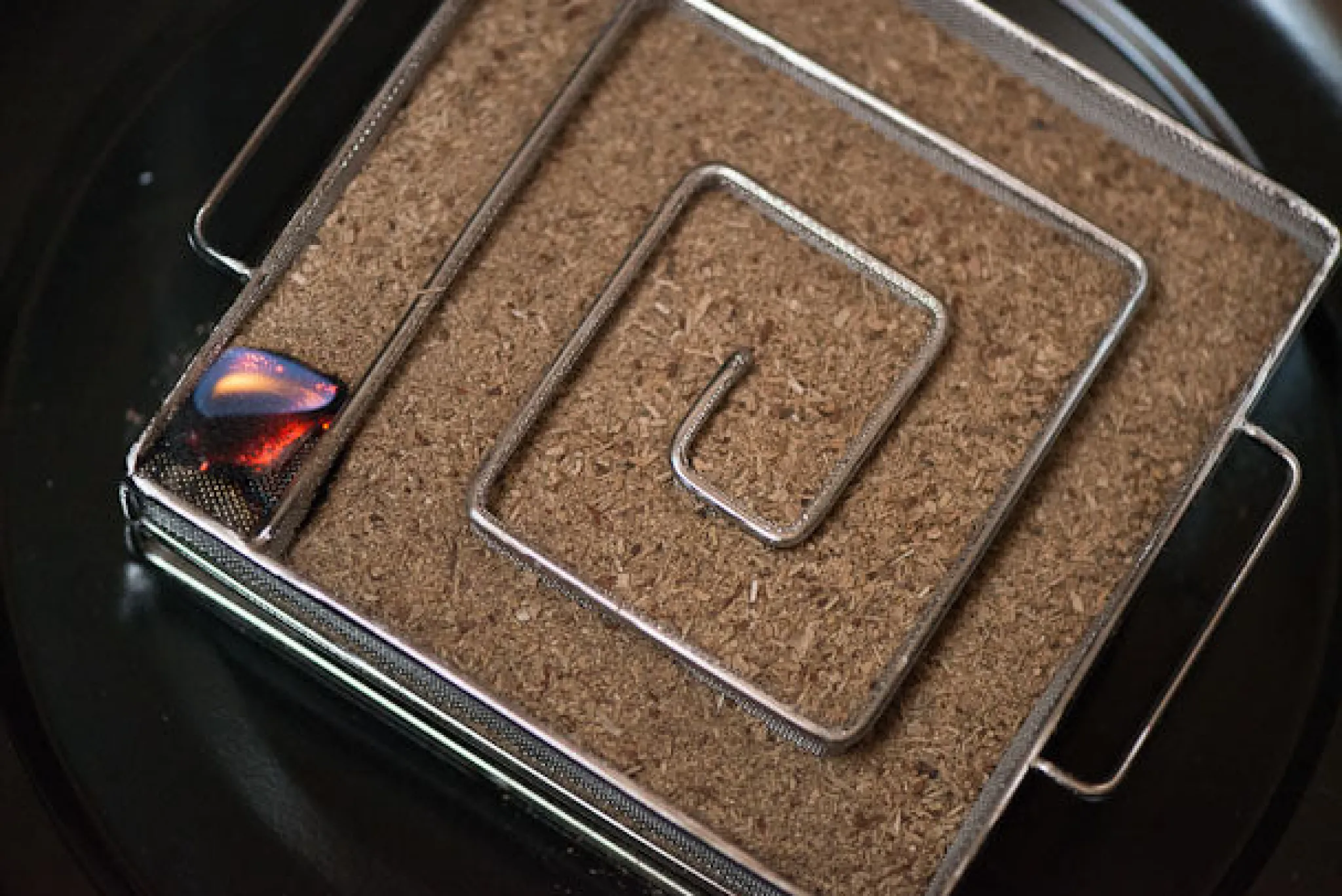 Next, fill the smoking tray with the oak wood dust, and light the corner using a candle – after a minute or so, once the dust starts to smoulder, remove the candle and blow out. The smoke will wind its way through the maze over the course of ten hours, releasing a steady stream of smoke. Add spices or herbs, or use different flavoured wood dust to scent the smoke and pair it with specific foods. Try everything from haddock, to home-smoked salmon, bacon, brisket, ribs and cheeses.