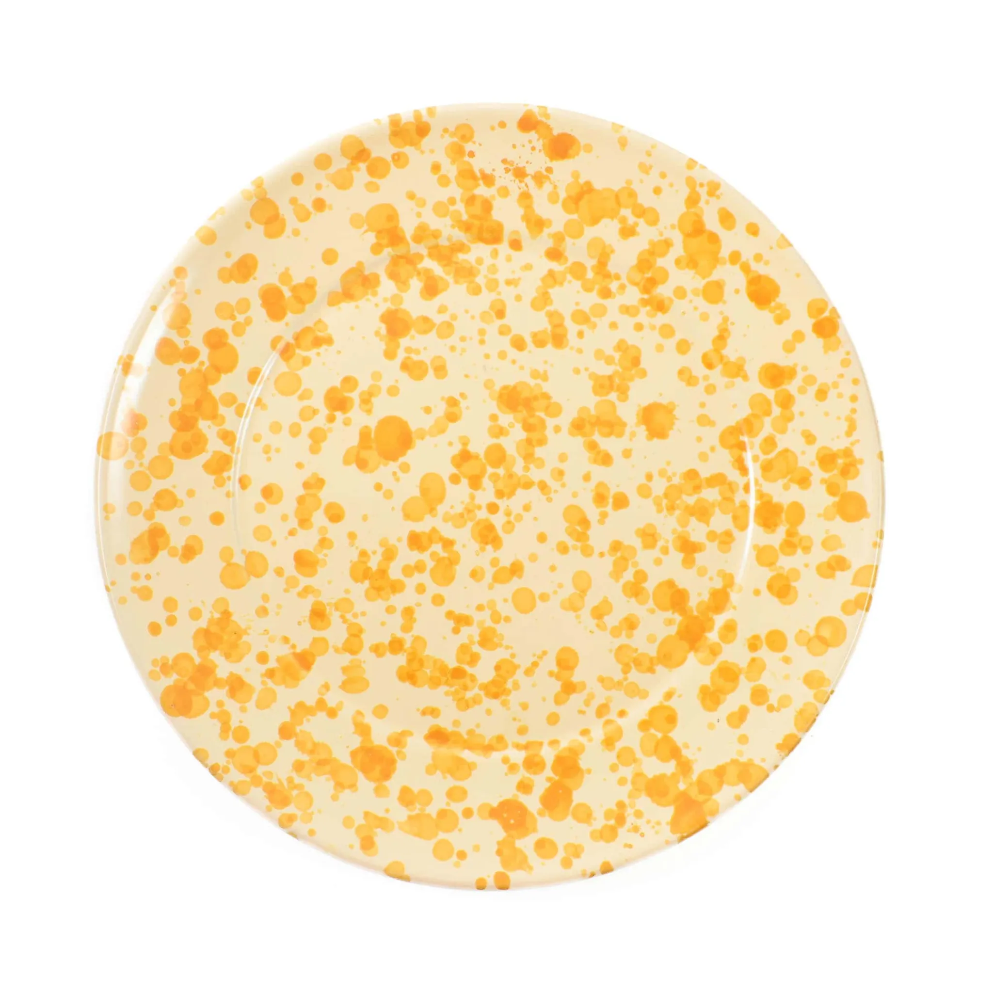 Use the Puglia dark yellow splatter dinner plate to serve ravioli, melanzane parmigiana or roast chicken with garlic and rosemary. Handmade in Puglia, this off-white plate has a yellow splatter design inspired by Amalfi lemons and Italian sunshine.