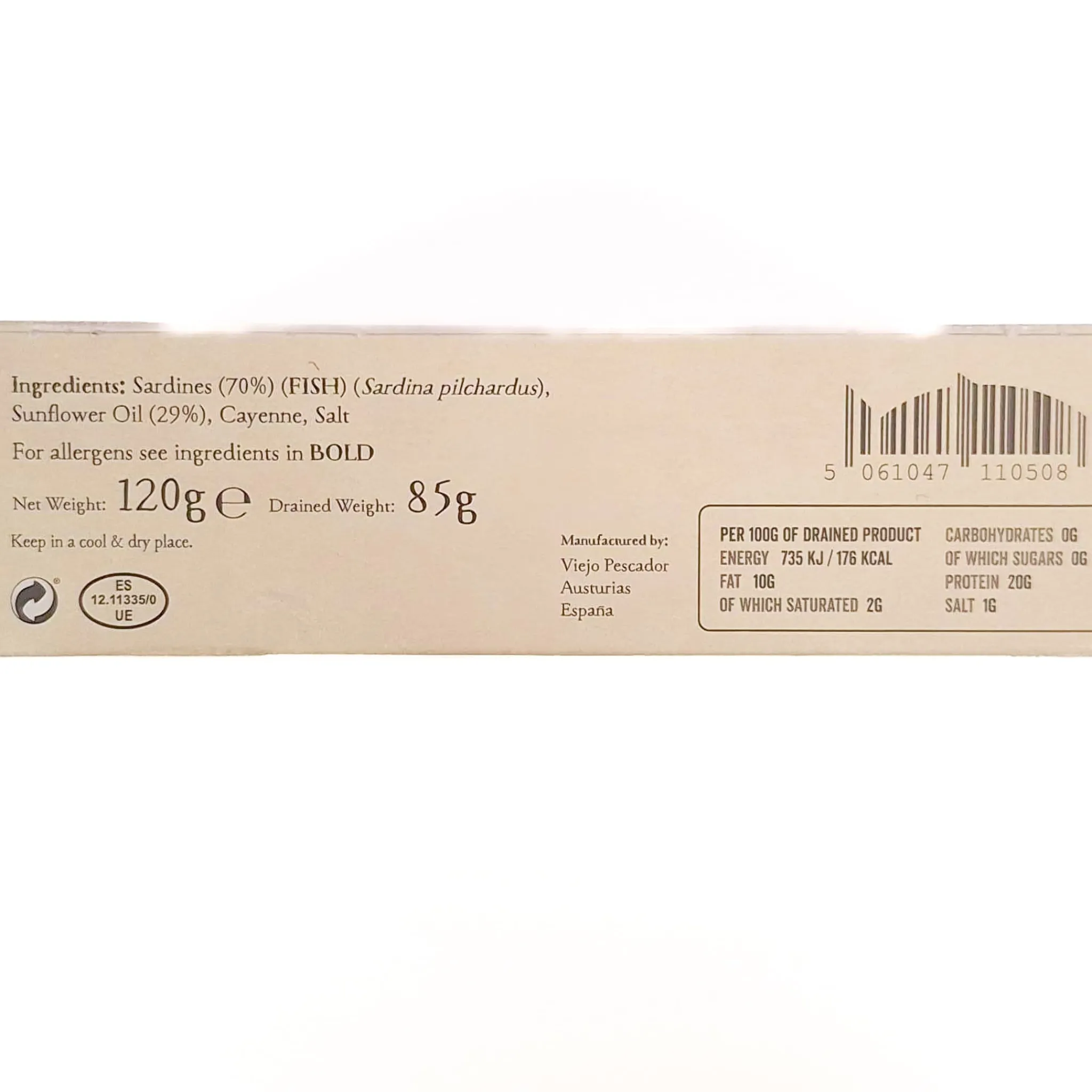 Product formulations and details may change. For the latest ingredients and allergen information always check product packaging prior to consumption. Ingredients: Sardines, sunflower oil, cayenne, salt