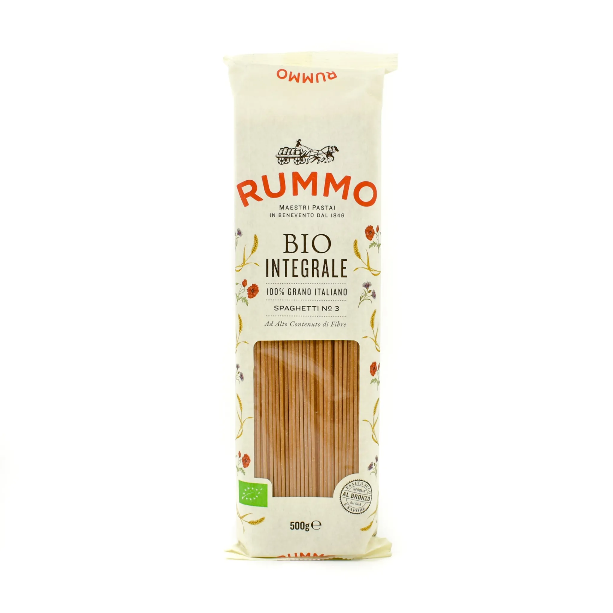 Rummo wholemeal organic spaghetti no. 3 is the new wholemeal version of this favourite pasta shape.The pasta is made with organic wholemeal durum semolina and extruded through bronze dies. The rough surface allows sauce to cling to the pasta. Rummo wholemeal organic spaghetti cooks in 9 minutes.