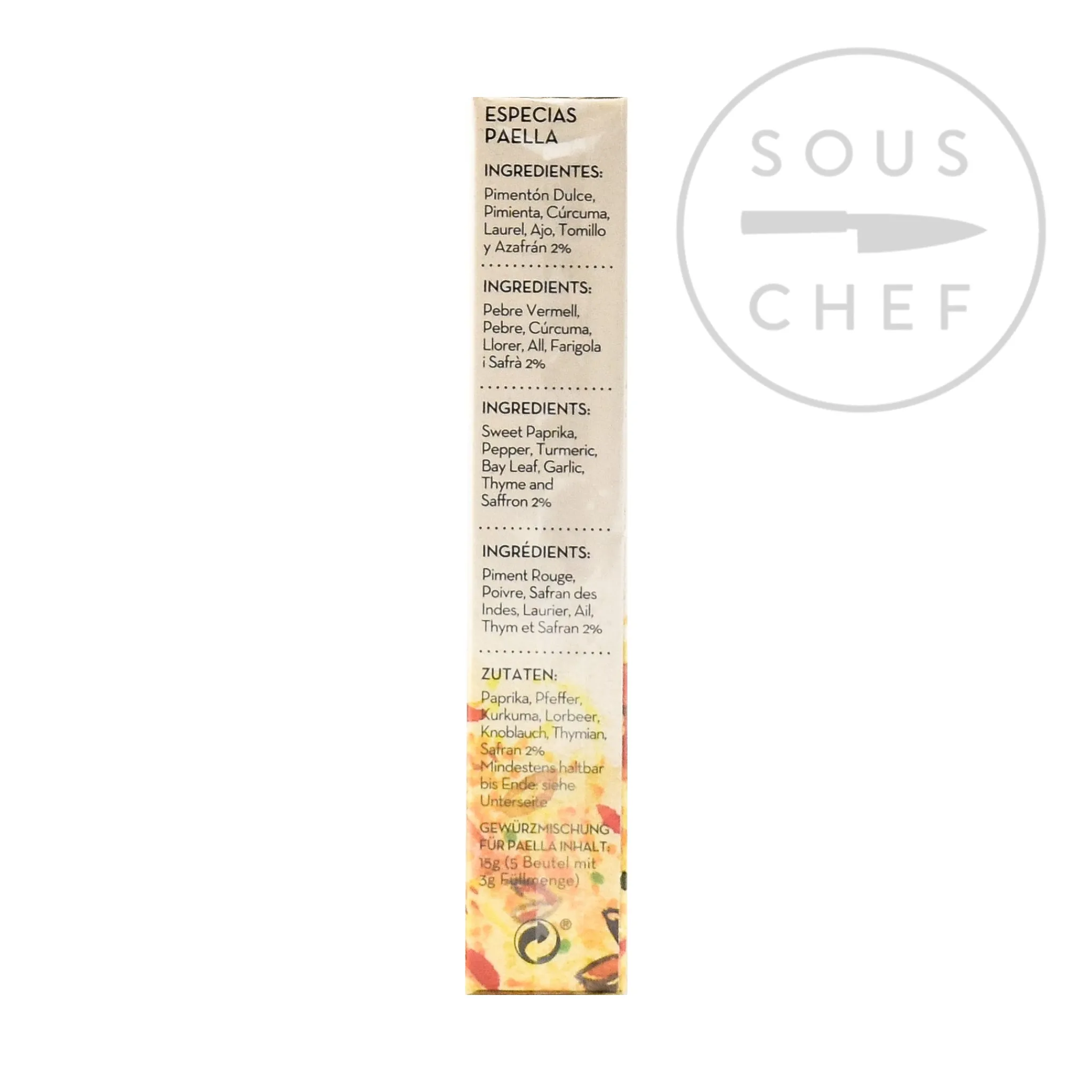 Use paella seasoning sachets to make an authentic looking and tasting paella quickly and easily. Simply sprinkle the contents of one sachet into cooked, short-grain rice and stir through. The paella seasoning includes five sachets of saffron and turmeric to give your paella the classic golden colour, and sweet paprika, pepper, bay leaf, garlic and thyme for great flavour. Just add the toppings of your choice – seafood, chicken, vegetables – and your paella is ready to serve.