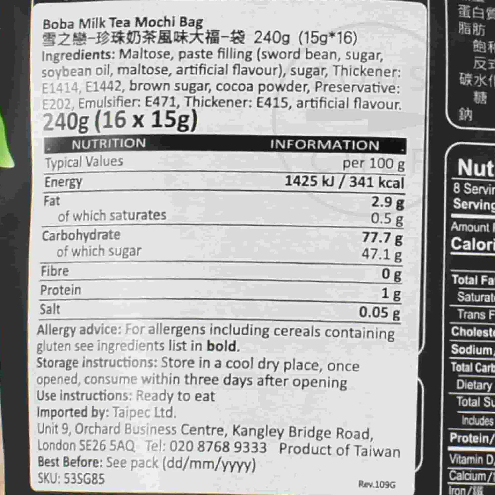 Product formulations and details may change. For the latest ingredients and allergen information always check product packaging prior to consumption. Ingredients: Maltose, paste filling (sword bean, sugar, soybean oil, maltose, artificial flavour), sugar, thickener: E1414, E1442, brown sugar, cocoa powder, preservative: E202, emulsifier: E471, thickener: E415, artificial flavour.