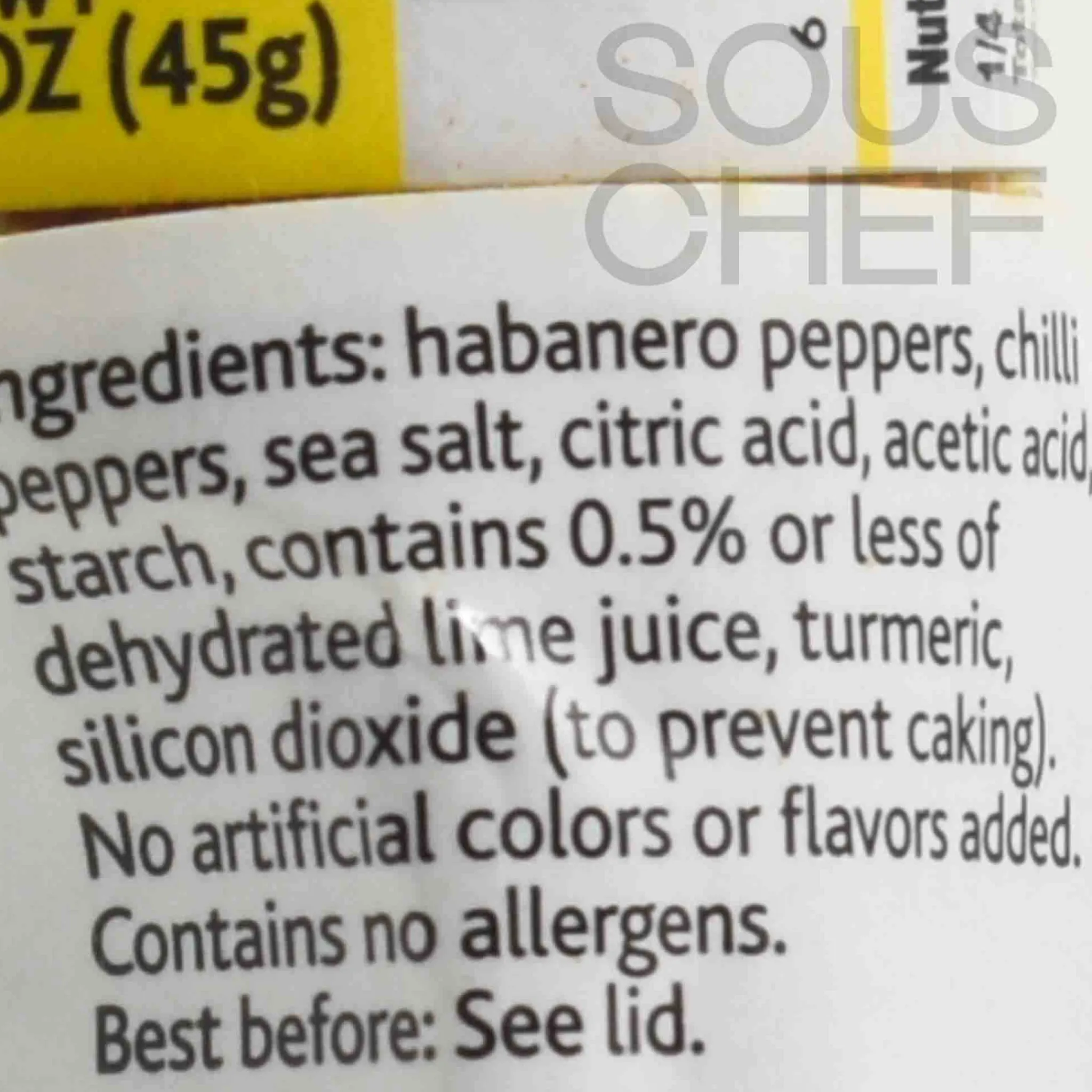 Product formulations and details may change. For the latest ingredients and allergen information always check product packaging prior to consumption. Ingredients: Habanero peppers, chili peppers, citric acid, acetic acid, starch, contains 0,5% or less of dehydrated lime juice, turmeric, silicon dioxide (to prevent caking)