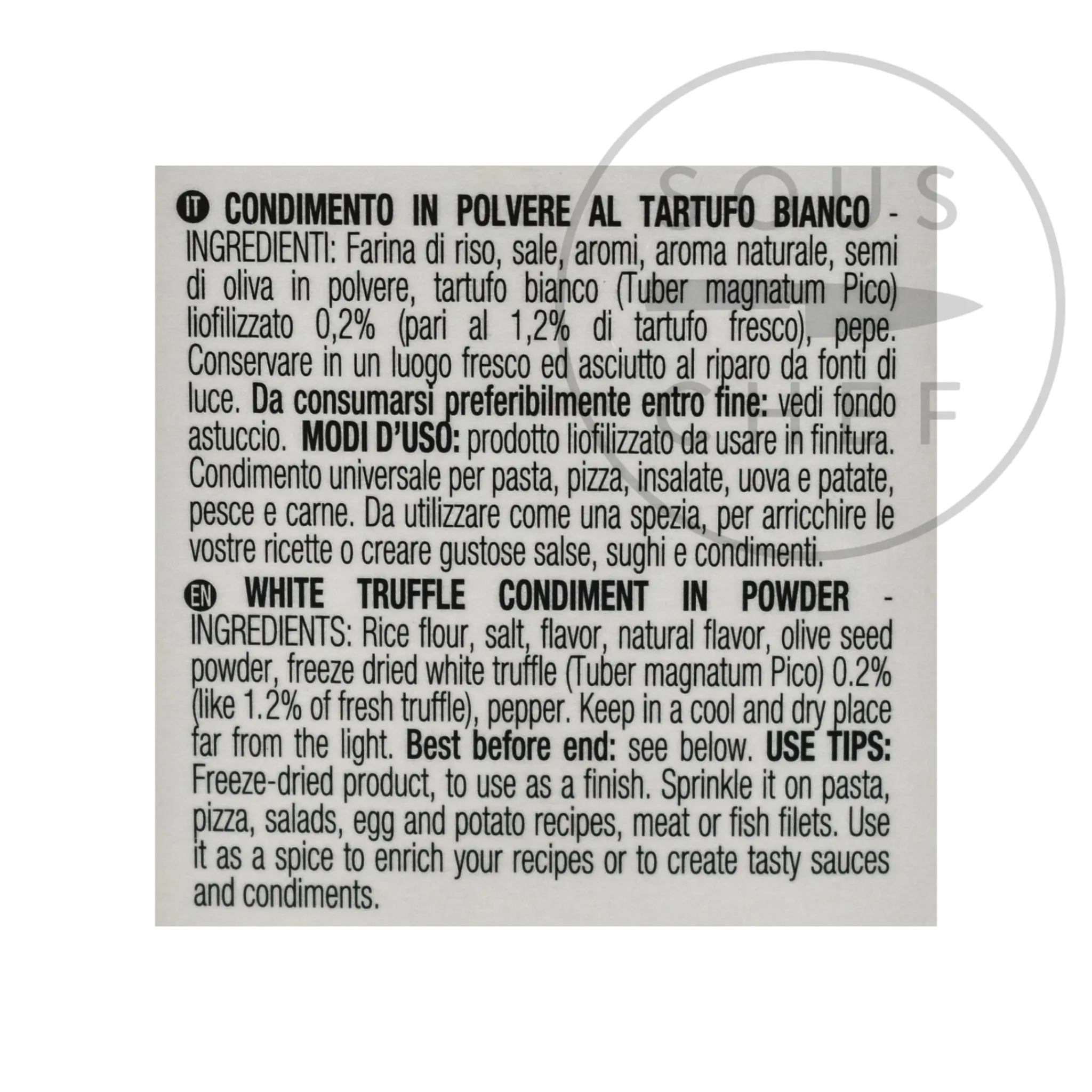 Product formulations and details may change. For the latest ingredients and allergen information always check product packaging prior to consumption. Ingredients: Rice flour, salt, flavour, natural flavour, olive seed powder, freeze dried white truffle (tuber magnatum pico) 0.2% (like 1.2% of fresh truffle), pepper.