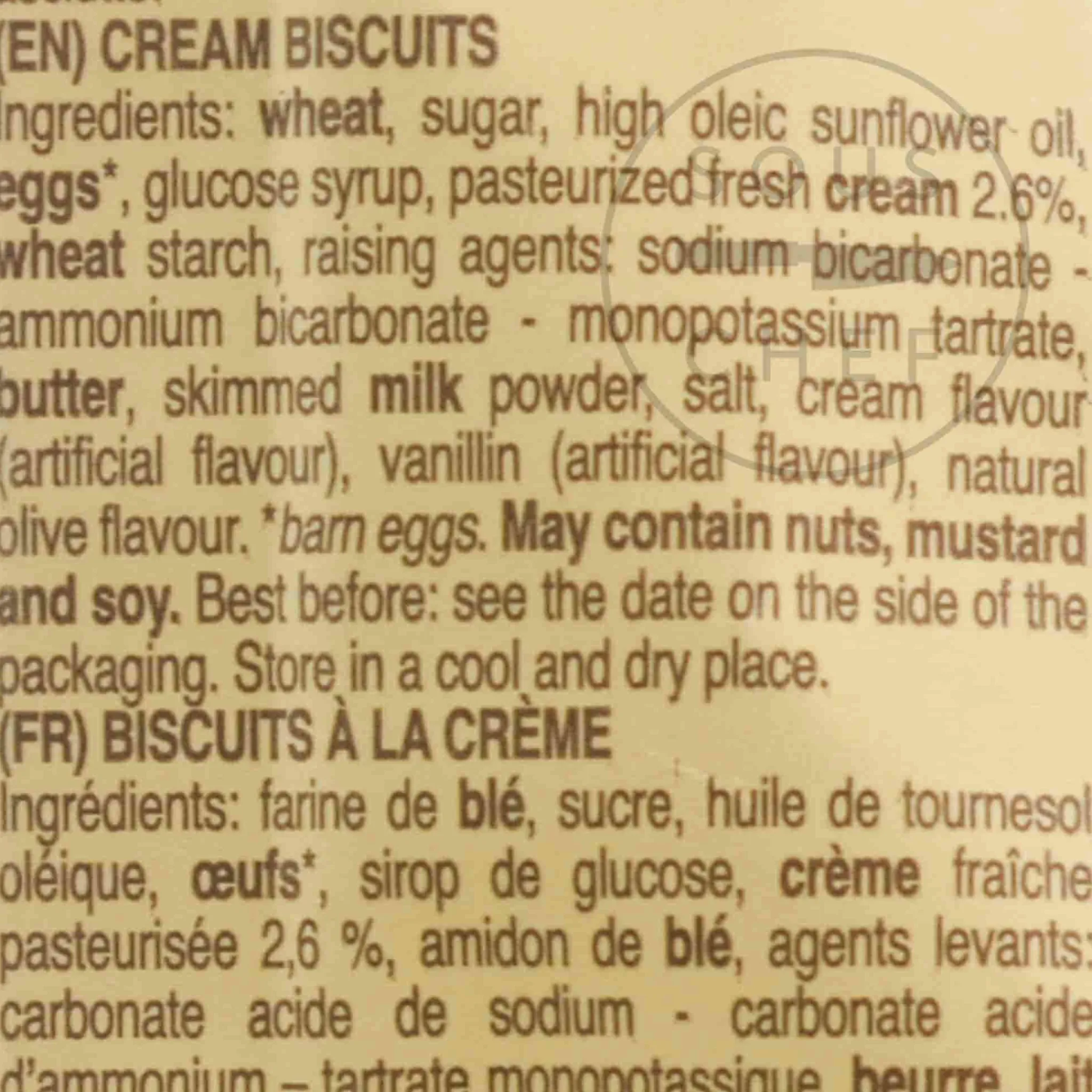 Product formulations and details may change. For the latest ingredients and allergen information always check product packaging prior to consumption. Ingredients: Wheat flour, sugar, sunflower oil 12%, eggs*, glucose syrup, cream 2,6% (contain milk), wheat starch, raising agents: sodium hydrogen carbonate – ammonium hydrogen carbonate – monopotassium tartrate, butter, skim milk powder, salt, flavourings.*barn eggs