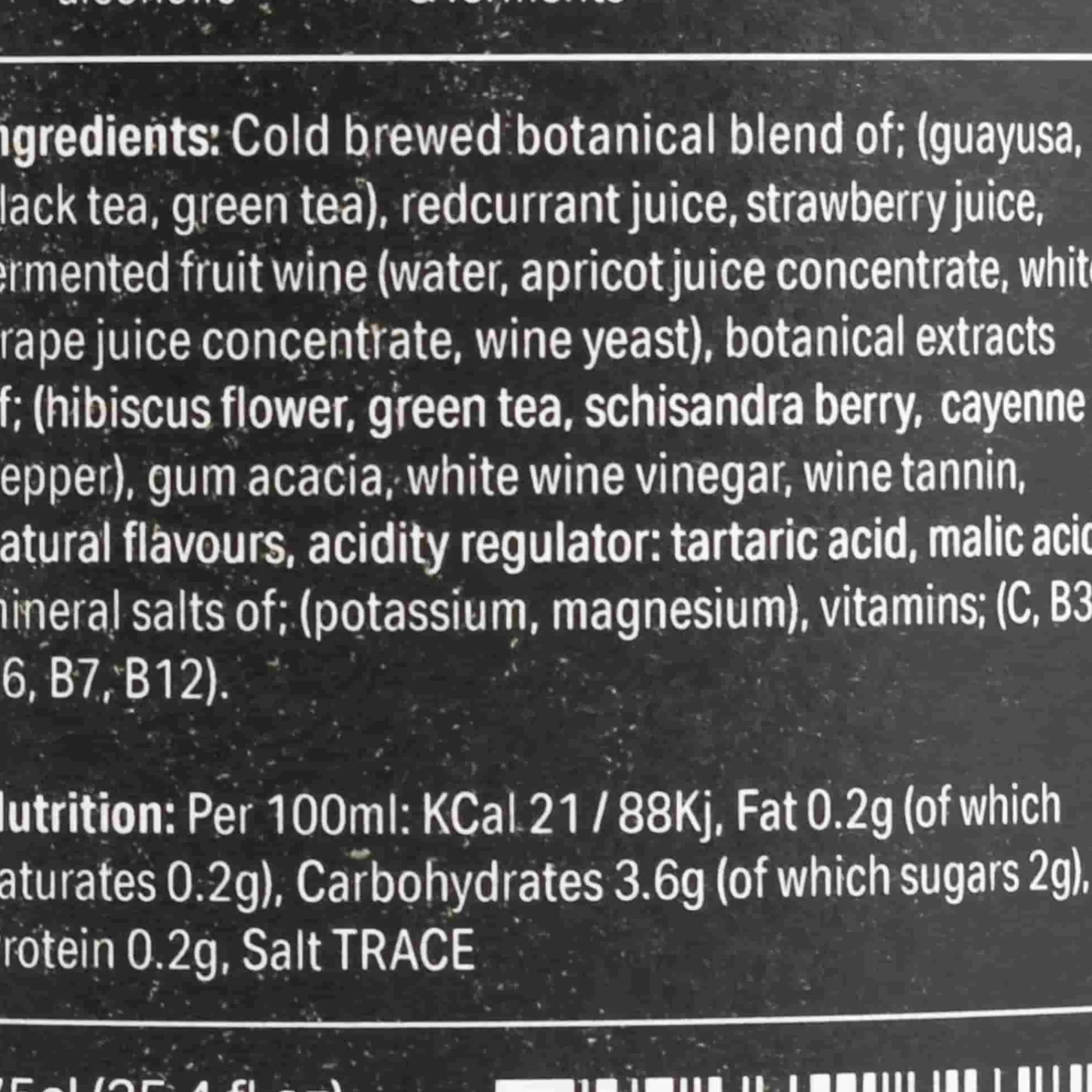 Product formulations and details may change. For the latest ingredients and allergen information always check product packaging prior to consumption. Ingredients: Cold brew botanical blend of; (guayusa, black tea, green tea), redcurrant juice, strawberry juice, fermented fruit wine (water, apricot juice concentrate, white grape juice concentrate, wine yeast), botanical extracts of; (hibiscus flower, green tea (l-theanine), schisandra berry, cayenne pepper), gum acacia, white wine vinegar, wine tannin, natural flavors, tartaric acid, malic acid, mineral salts of; (potassium, magnesium), vitamins; (c, b3, b6, b7, b12).