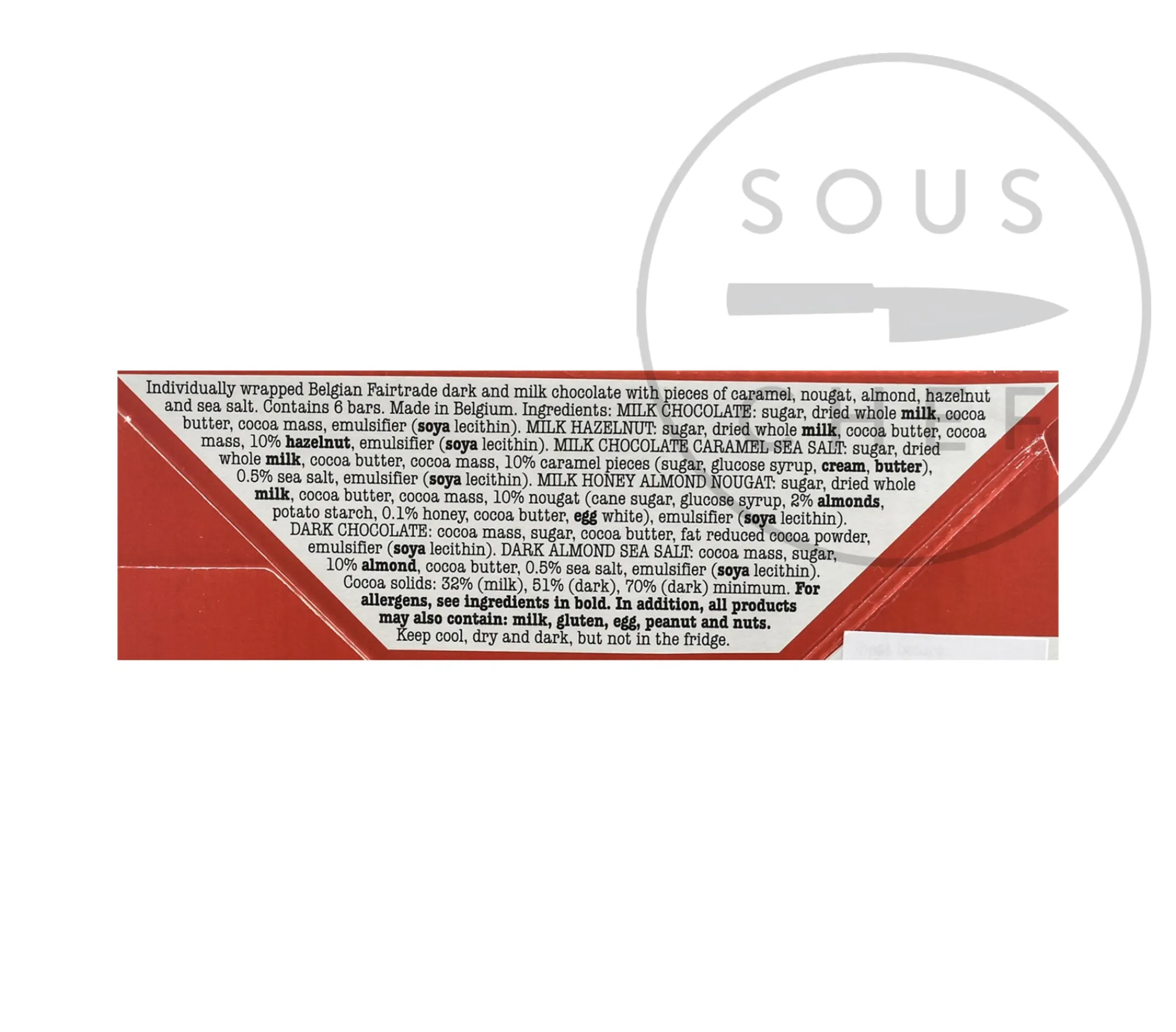 Whether you like to keep it classic, are a fan of nuts, or love nougat, the tasting selection has you covered. The selection includes classic milk chocolate, milk chocolate hazelnut, milk chocolate caramel sea salt, milk chocolate with honey almond nougat, dark chocolate, and dark chocolate almond sea salt. This complete collection makes a wonderful gift for those with a sweet tooth.