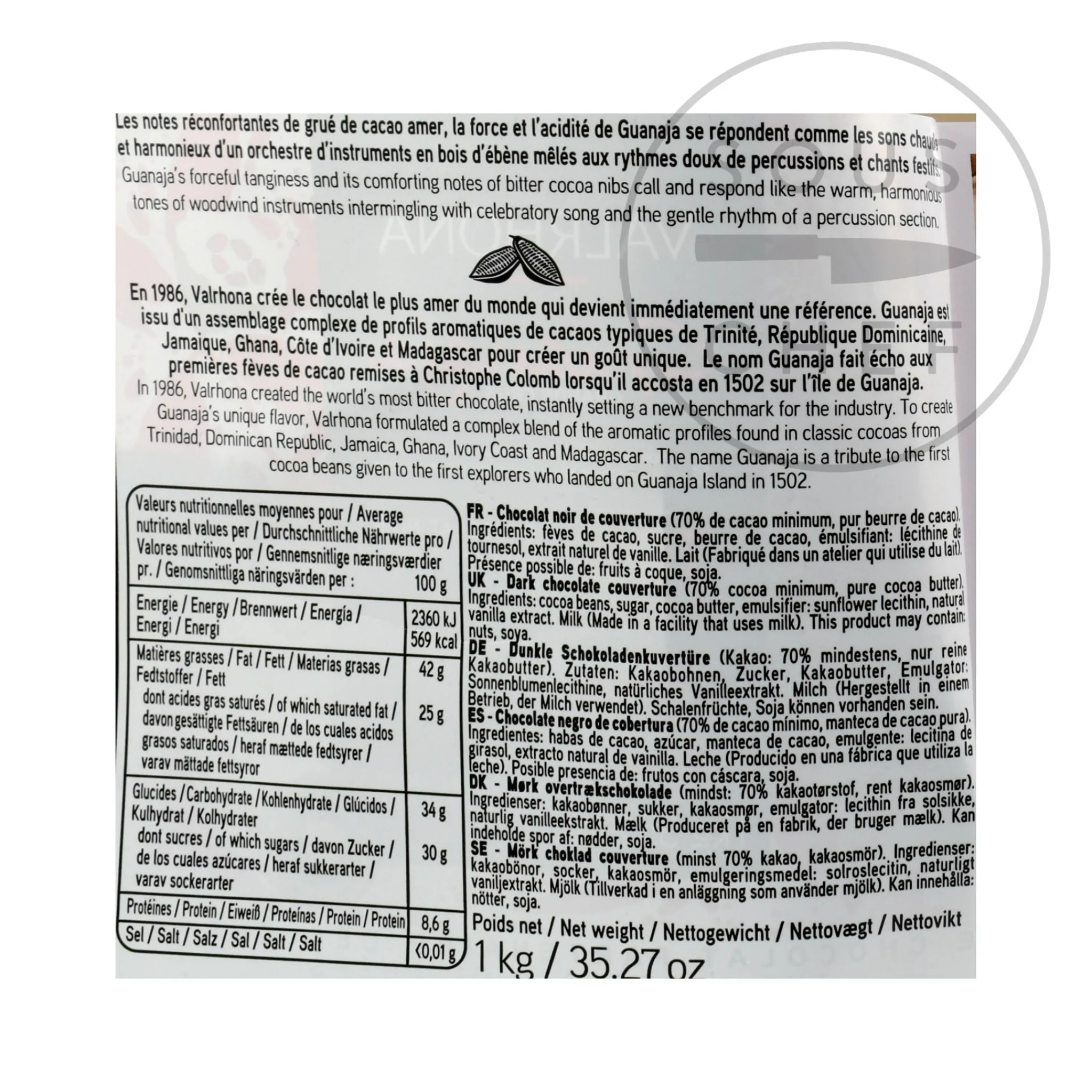 Valrhona Guanaja 70% is one of the world’s favourite dark chocolates, bittersweet and elegant. The individually moulded chocolate chips are easy to weigh out and very quick to melt with their trademark Valrhona feves or bean shape. Valrhona Guanaja couverture has a rounded mouthfeel and balanced bitterness, from a masterful blend of Criollo and Trinitario cocoa beans. The addition of Criollo beans brings a fabulous complexity from the world’s finest cacao variety, though difficult to grow and which yields very little.