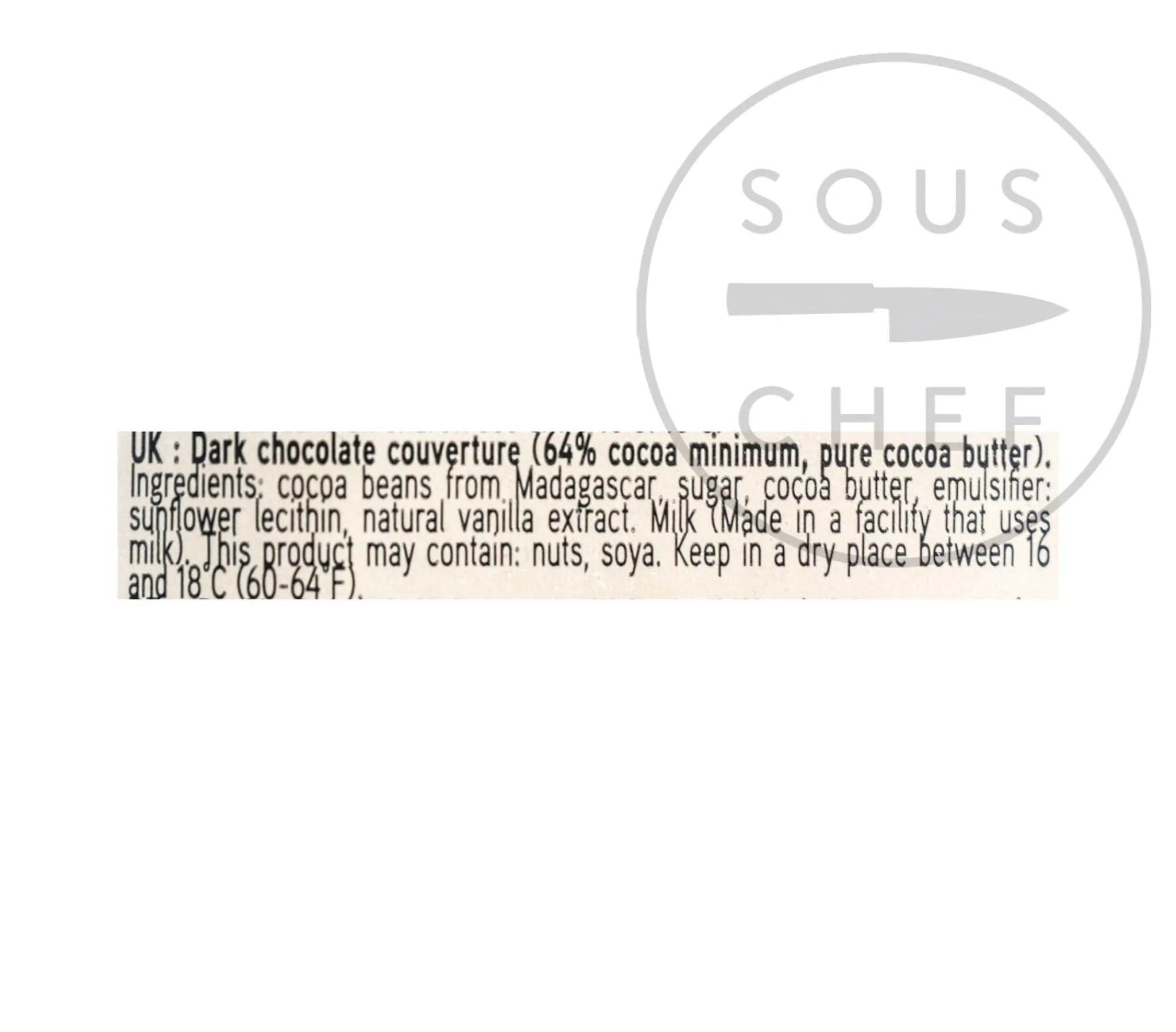 Valrhona Manjari 64% dark chocolate chips are fresh and tangy with a lingering deep chocolate finish. The first choice of patisserie chefs across the world, these chips have a perfect balance of cocoa solids and sugar. The Manjari chocolate contains a minimum of 64% cocoa solids and is made from a single variety of Madagascar cocoa bean.