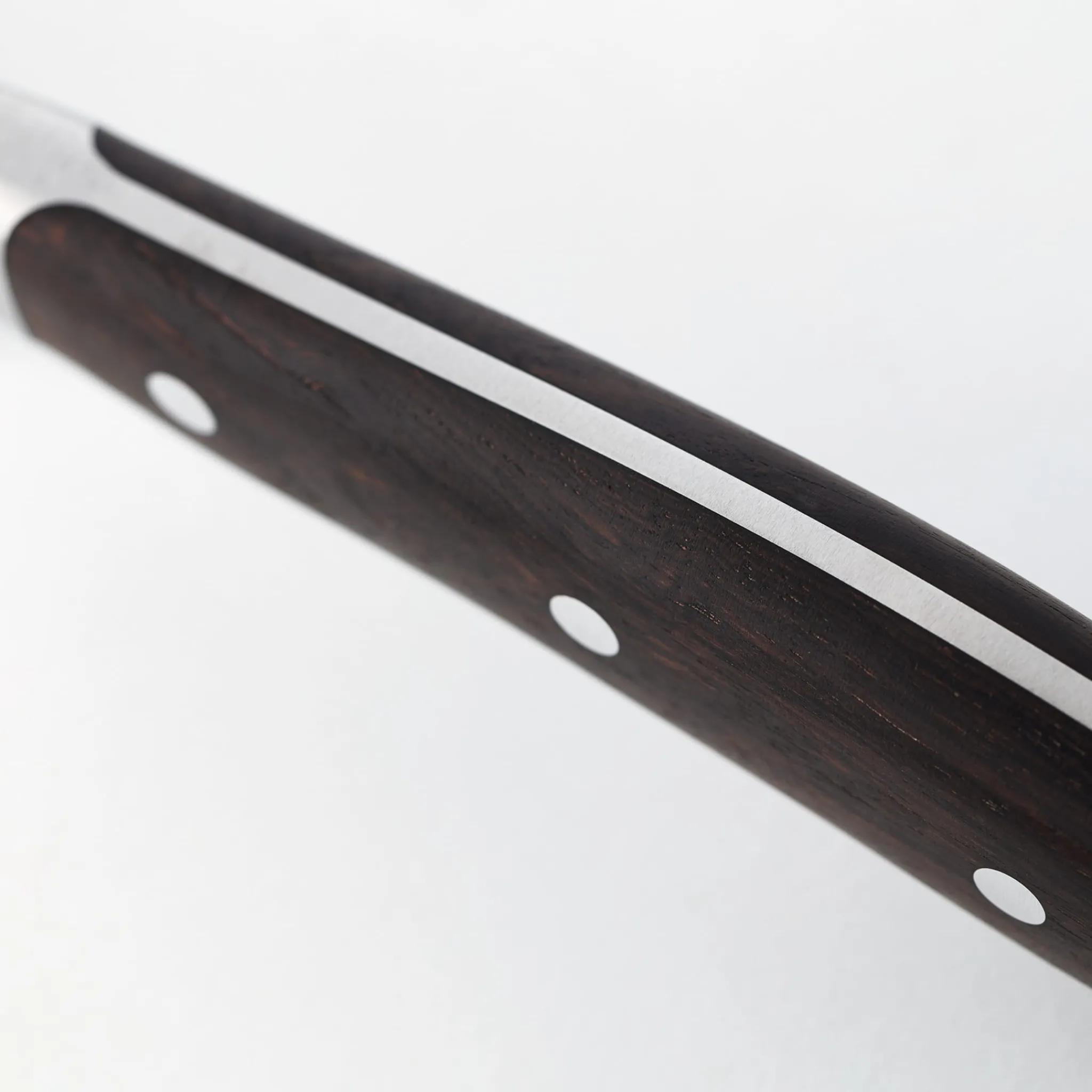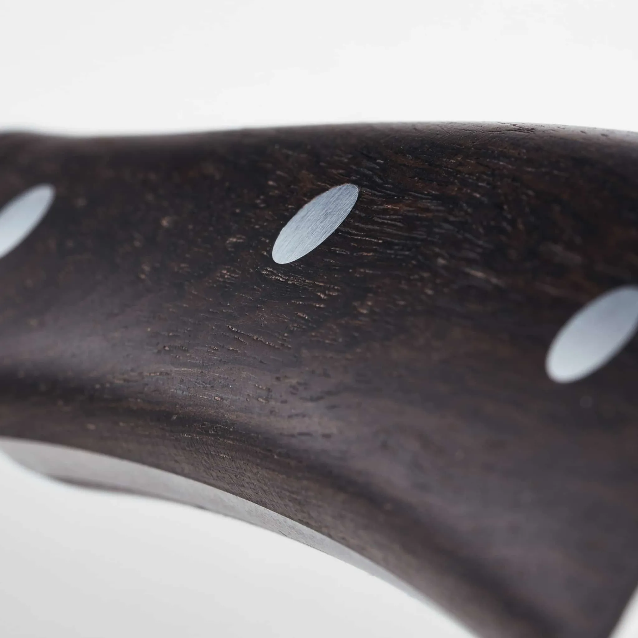 Where the Classic Ikon has a black plastic handle, the Ikon range has a more luxurious handle made from African Blackwood. Known for it’s dark brown colours, it is also a very dense wood and water resistant, making it very durable, and excellent to use as a knife handle.